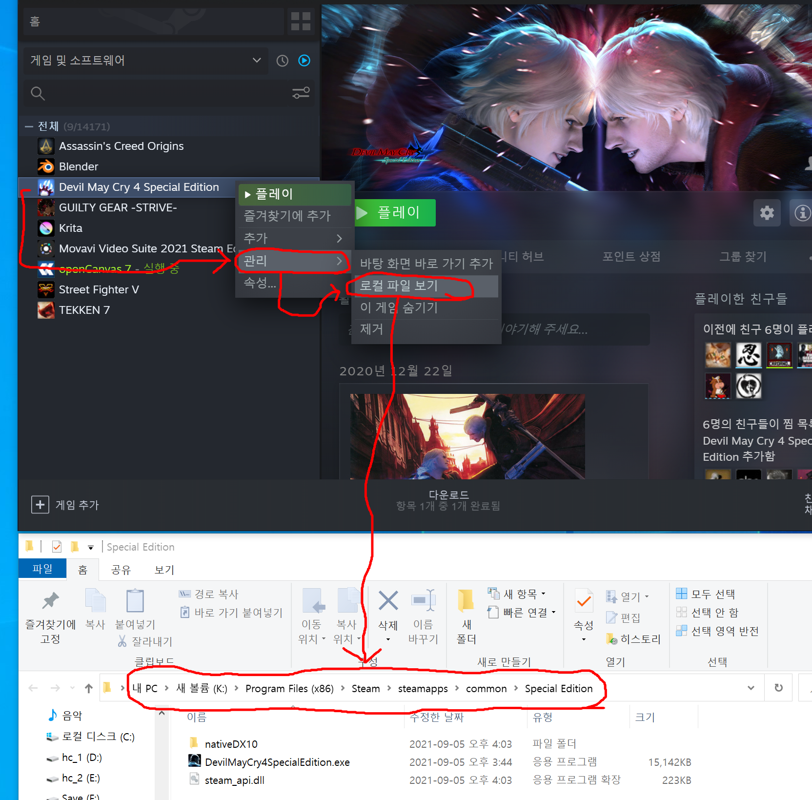 오른쪽 클릭후 "관리->로컬 파일 보기" 를 눌러주면 해당 설치된 폴더가 나옵니다.