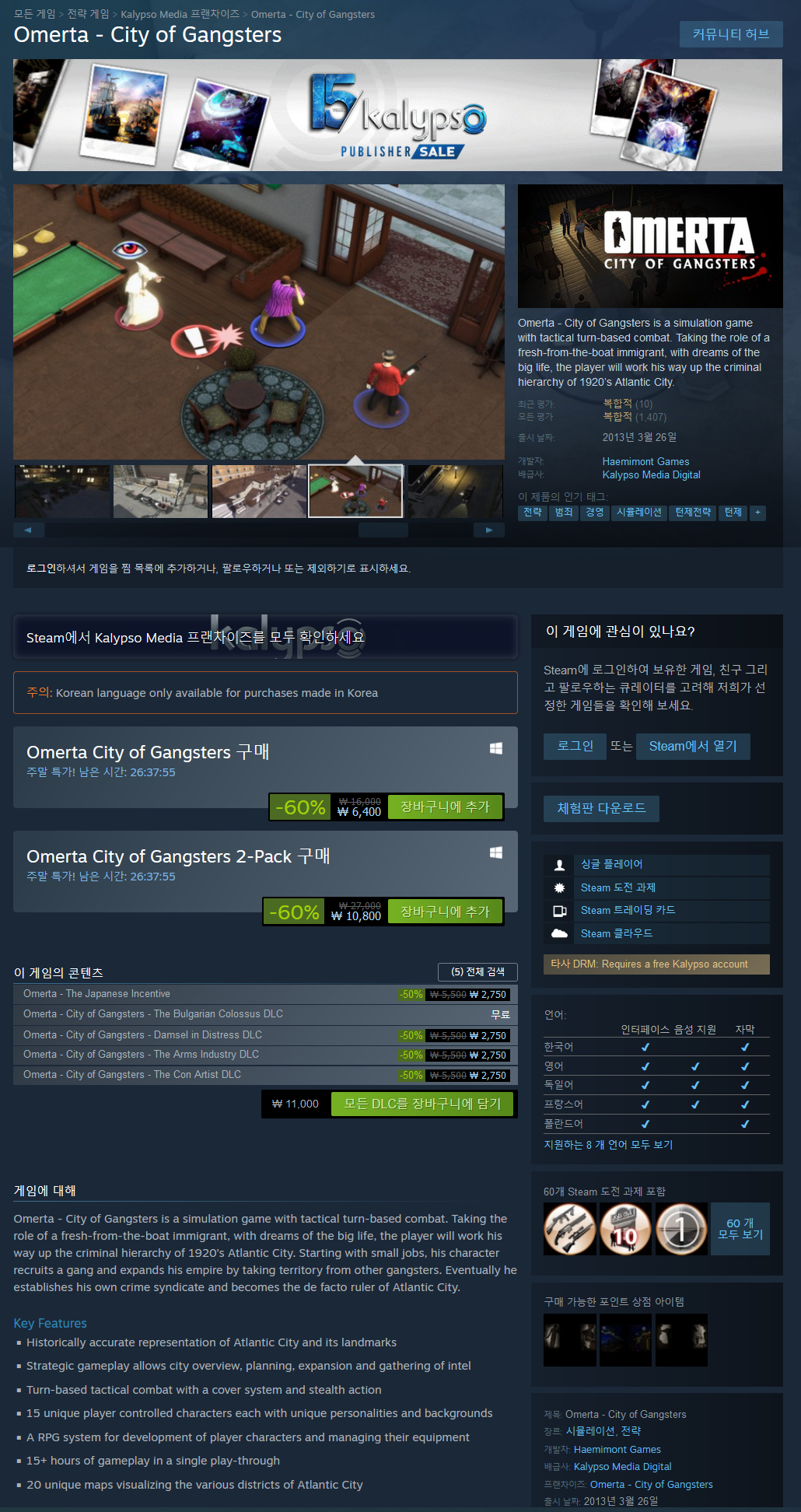 이러한 택틱스 전략 쟝르는 하드한 난이도의 게임이 많은만큼, 갱스터 쟝르에 거부감이 없다면 입문용으로 썩 괜찮은 난이도라고 생각합니다.
