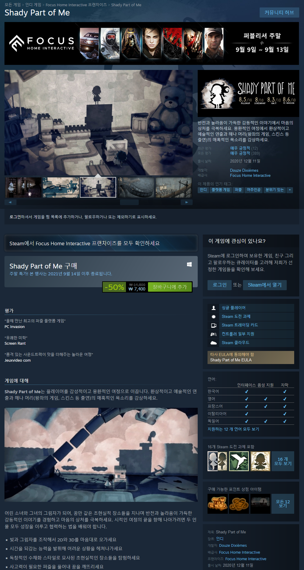 어린 소녀와 그녀의 그림자가 되어, 꿈만 같은 초현실적 장소들을 지나며 반전과 놀라움이 가득한 감동적인 이야기를 경험하고 마음의 상처를 극복하세요. 시적인 여정의 끝을 향해 나아가려면 두 인물 모두 성장을 이루고 협력하는 법을 배워야 합니다.