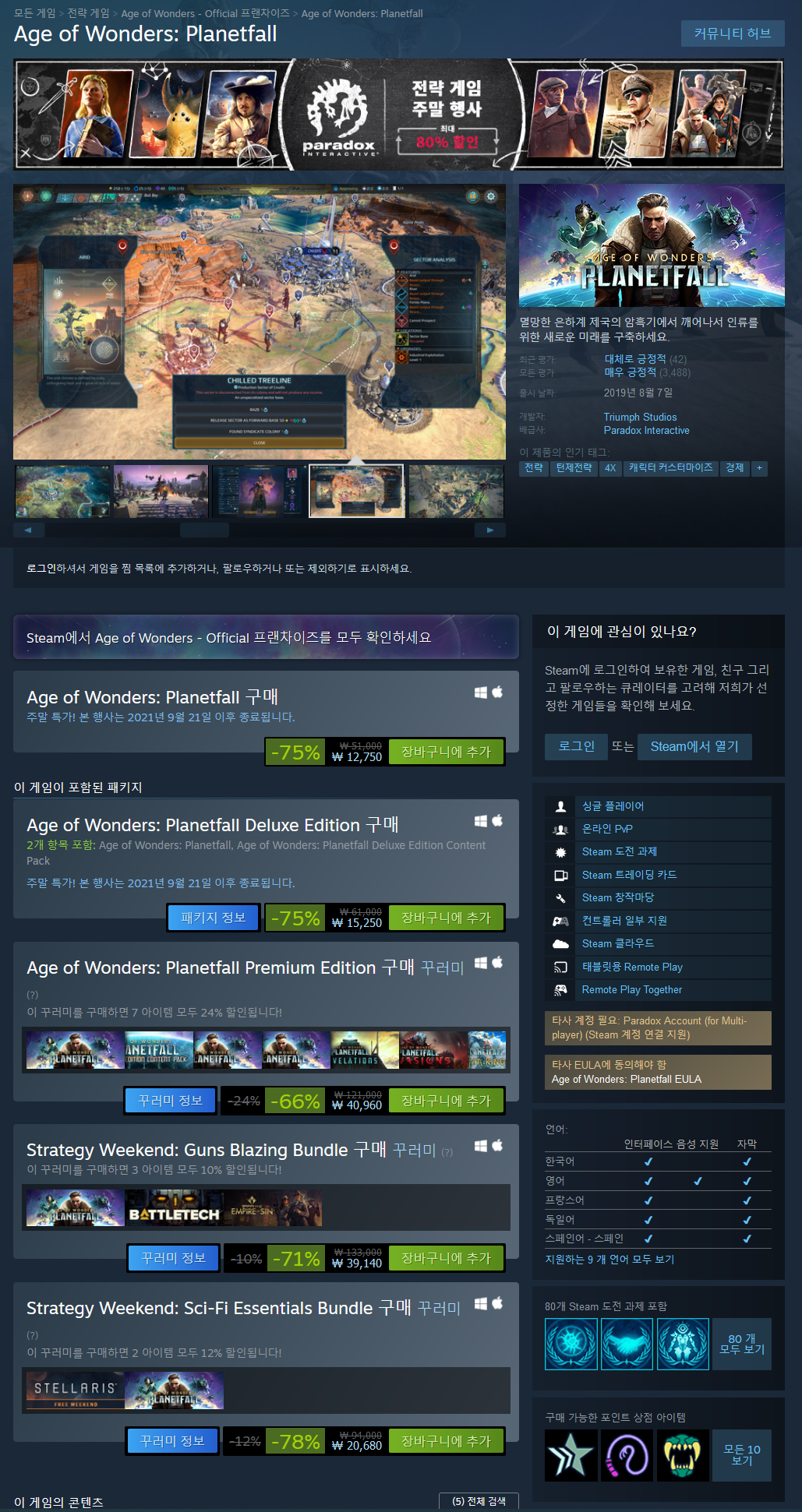 멸망한 은하계 제국의 암흑기에서 깨어나서 인류를 위한 새로운 미래를 구축하세요. 에이지 오브 원더: 플래닛폴은 Triumph Studios의 새로운 전략 게임입니다. 공격적인 뱅가드, 공룡을 타고 질주하는 아마존, 사이보그 좀비를 지휘하는 어셈블리까지, 총 6가지의 개성 넘치는 파벌 중에서 하나를 골라 자신만의 제국을 건설하세요. 재치, 군사력, 외교력을 발휘해 각 파벌의 미션을 진행하세요. 그리고 미션 진행 중에 행성 폐허를 탐험하고 다른 생존자들을 만나면서 몰락한 문명의 역사를 파헤치세요. 깊이 있는 싱글플레이어 캠페인에서, 무작위 스커미시 맵에서, 멀티플레이어에서 친구들을 상대로, 싸우고, 건설하고, 협상하고, 기술 발전을 이루면서 유토피아에 가까이 다가가세요.