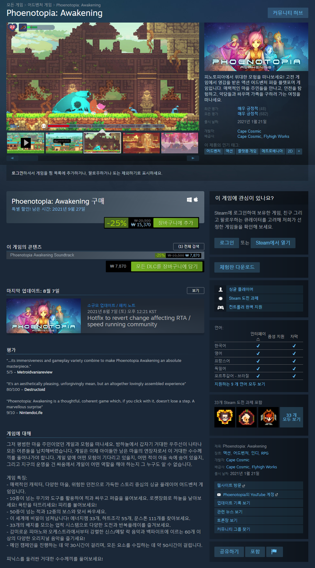 도트그래픽, 음악, 스토리, 전투시스템 빠지는 게 하나도 없는 플랫포머 명작입니다. 트레일러에서 매력을 느끼셨다면, 분명 직접 게임을 하셨을 때는 더한 감동을 받으시지 않을까 싶네요. 엔딩 보고 여운이 남았어요.