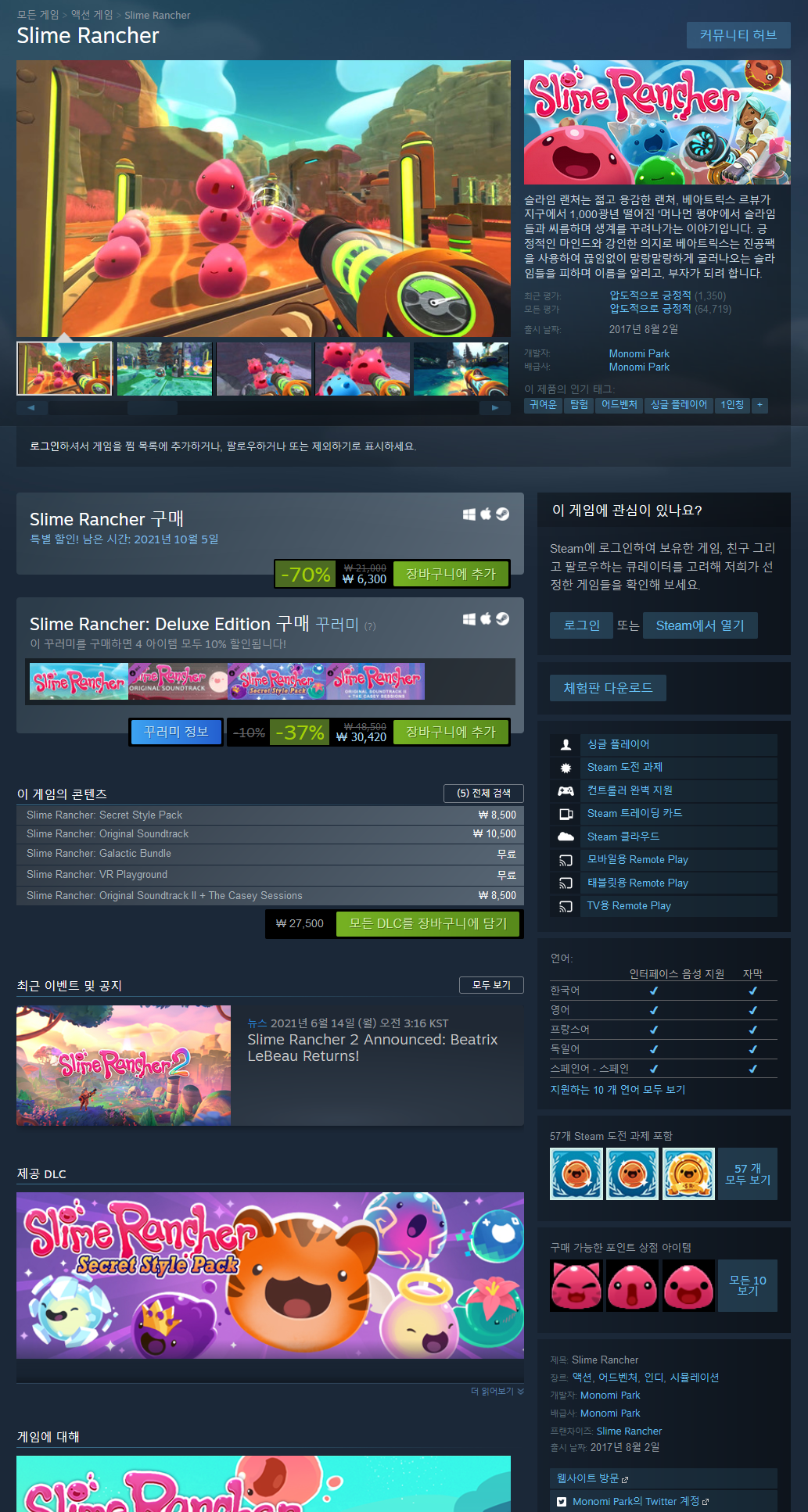 슬라임 랜처 : 주변에 귀여운 슬라임을 우리에 가두고 먹이를 주며 플로트를 만들고, 그 플로트를 팔아 돈을 벌고, 여러 시설을 만들거나 발전시키고, 그 와중에 맵에 뿌려져 있는 고르도 슬라임을 찾아 터뜨리고, 열쇠나 텔레포트 연결 지역 얻어서 다른 지역으로 가고, 이것을 반복하다가 여러 스토리...라고 보기는 좀 그런 기록들 쫓아가는 게임입니다.