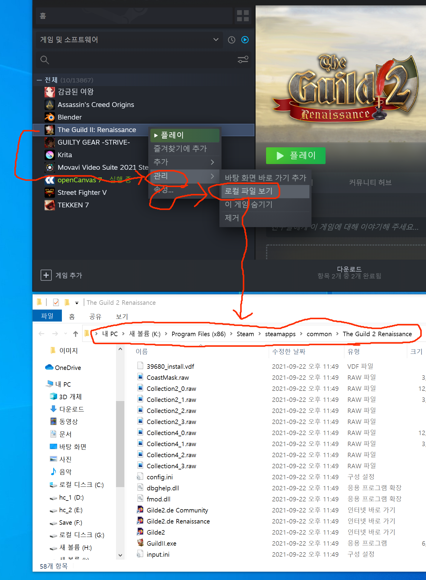 오른쪽 클릭후 "관리->로컬 파일 보기" 를 눌러주면 해당 설치된 폴더가 나옵니다.