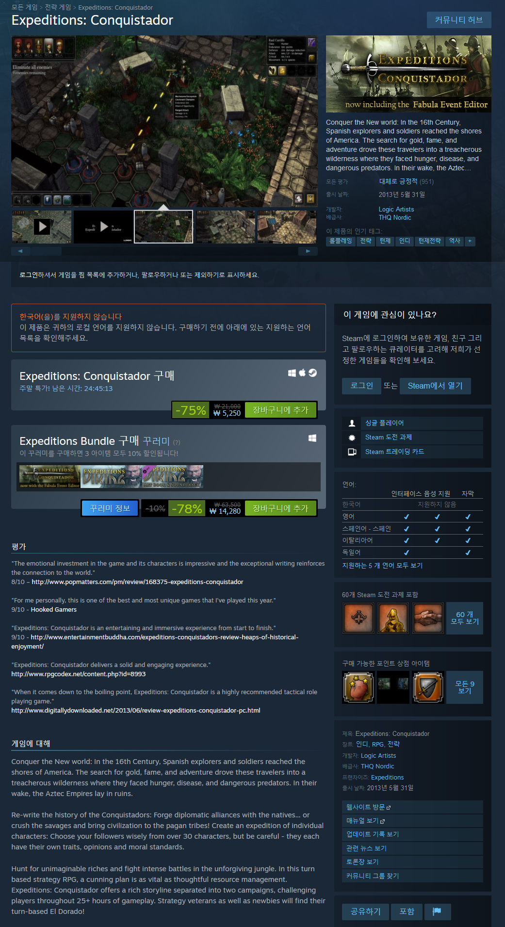 상상할 수 없는 부를 사냥하고 용서할 수 없는 정글에서 치열한 전투를 벌이십시오. 이 턴 기반 전략 RPG에서 교활한 계획은 사려 깊은 자원 관리만큼 중요합니다. Expeditions: Conquistador는 두 개의 캠페인으로 분리된 풍부한 스토리라인을 제공하여 25시간 이상의 게임 플레이를 통해 플레이어에게 도전합니다. 전략 베테랑과 초보자 모두 턴제 El Dorado를 찾을 수 있습니다!