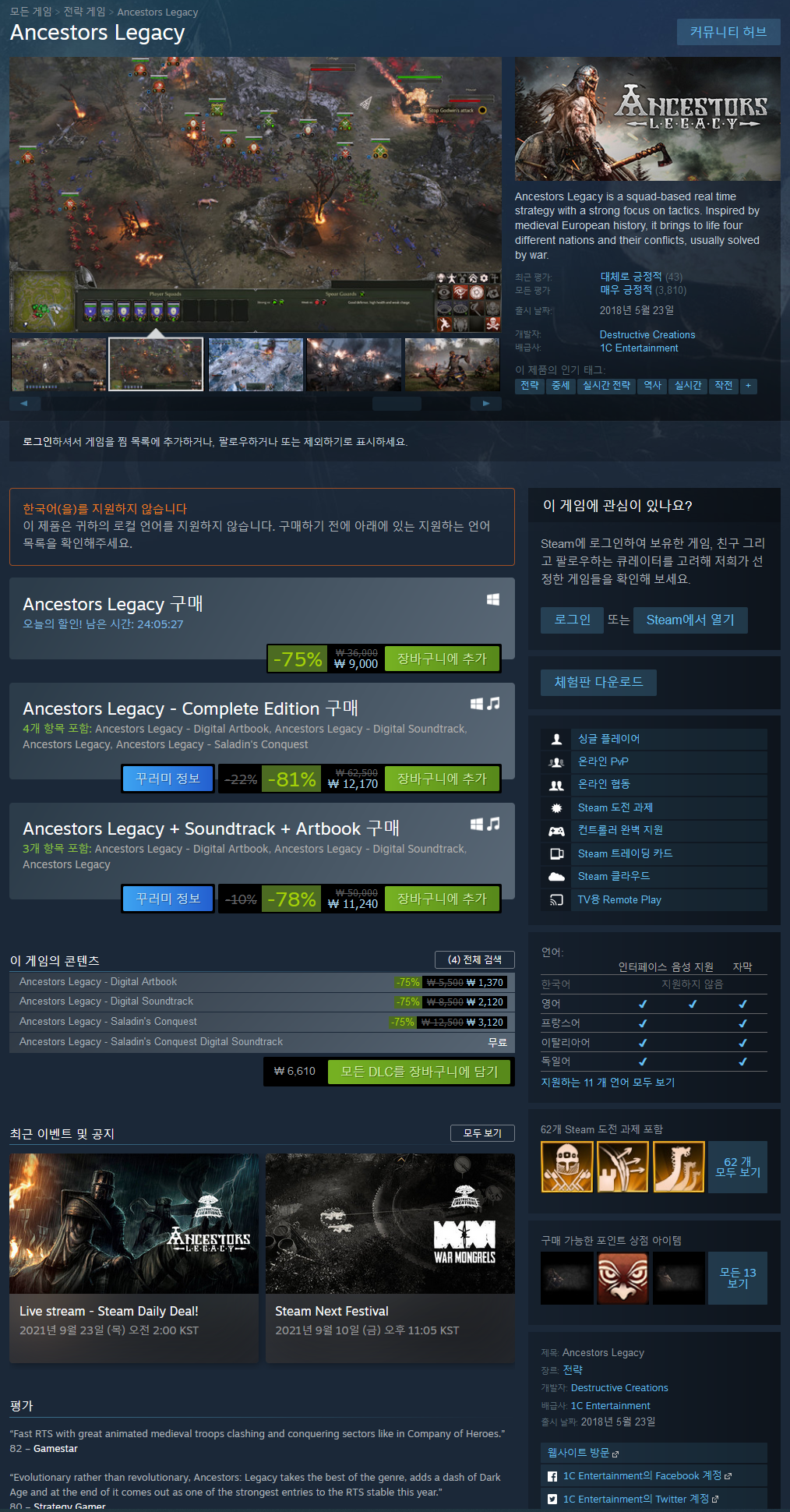Ancestors Legacy는 중세 시대의 역사적 사건의 영향을 받은 역사에서 영감을 받은 실시간 전략 게임입니다. 이 게임은 자원 관리와 기지 건설을 Unreal Engine 4 기술 덕분에 매우 자세하게 렌더링된 광대한 전장에서 대규모 분대 기반 전투와 결합합니다. 버튼 하나만 누르면 전투의 한가운데에 있게 하는 영화 같은 액션 카메라 덕분에 이전과는 전혀 다른 중세 시대의 유혈 사태를 경험하십시오.