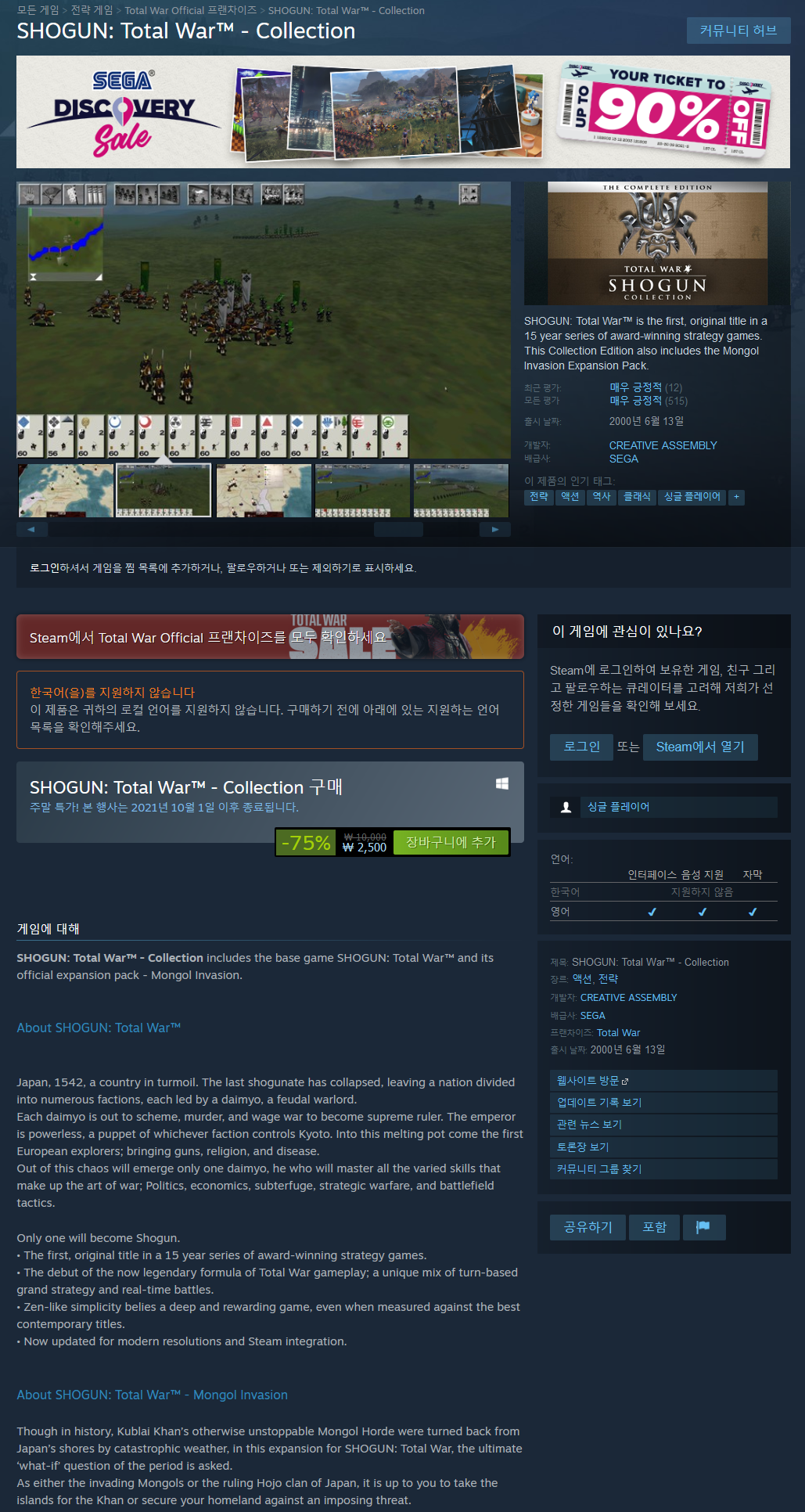 SHOGUN: Total War™ - 컬렉션에는 기본 게임인 SHOGUN: Total War™와 공식 확장팩인 Mongol Invasion이 포함됩니다.