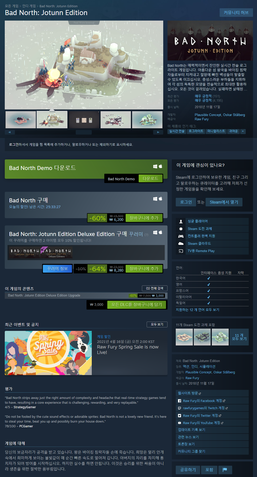 Bad North는 매력적이면서 잔인한 실시간 전술 로그라이트 게임입니다. 아름다운 섬 왕국을 바이킹 침략자들로부터 지켜내고 절망에 빠진 백성들이 탈출할 수 있도록 이끄십시오. 충성스러운 부하들을 지휘하여 각 섬의 독특한 모양을 전술적으로 최대한 활용하십시오. 모든 것이 걸려있습니다. 실패하면 살해된 부하들의 피가 땅을 붉게 물들이는 것을 지켜봐야 합니다.