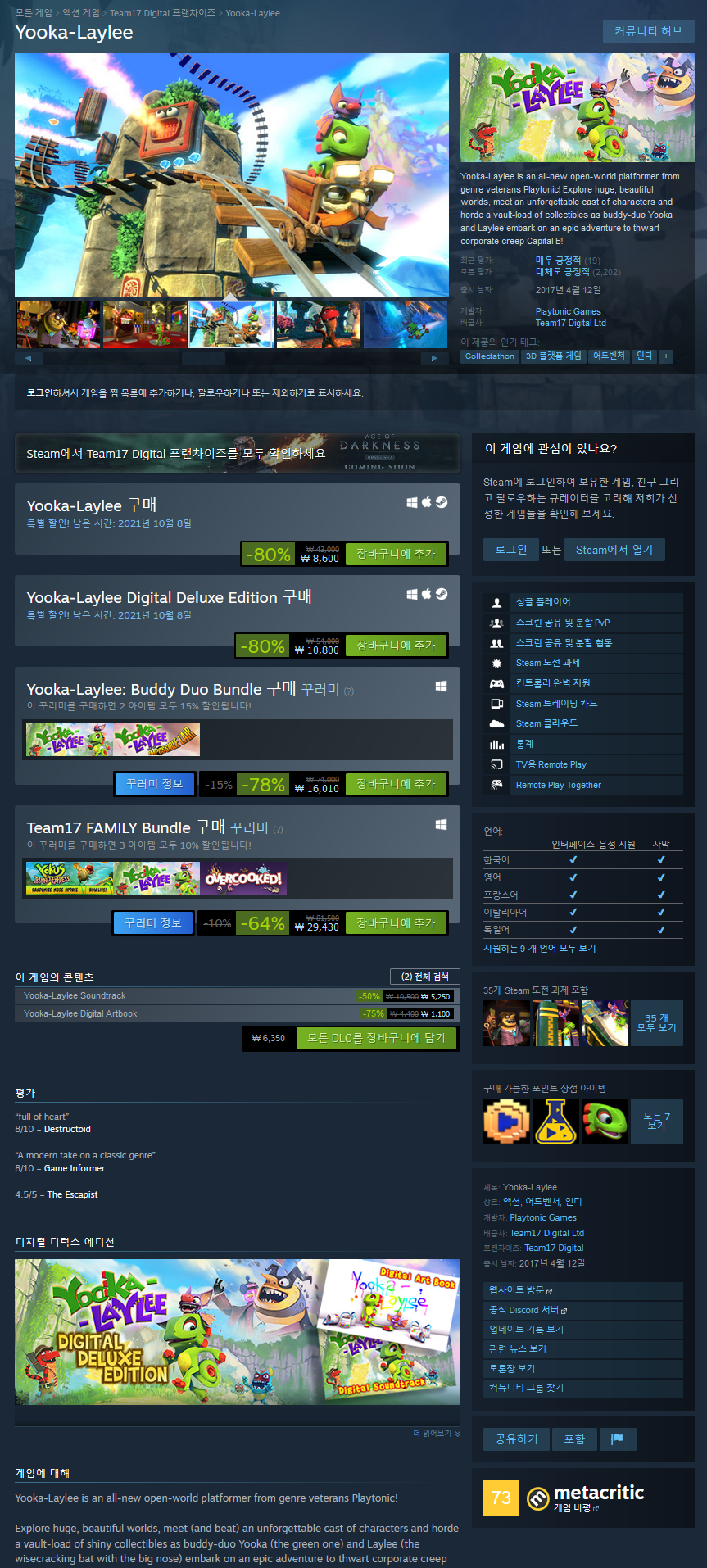 거대하고 아름다운 세계를 탐험하고, 잊을 수 없는 캐릭터를 만나고(그리고 때려눕히고), 친구 듀오 Yooka(초록색)와 Laylee(큰 코를 가진 현명한 크래킹 박쥐)가 서사시에 착수하면서 금고에 가득 찬 반짝이는 수집품을 모으세요. 기업 크리프 Capital B와 전 세계의 모든 책을 흡수하고 순수한 이익으로 전환하려는 그의 사악한 계획을 저지하기 위한 모험!