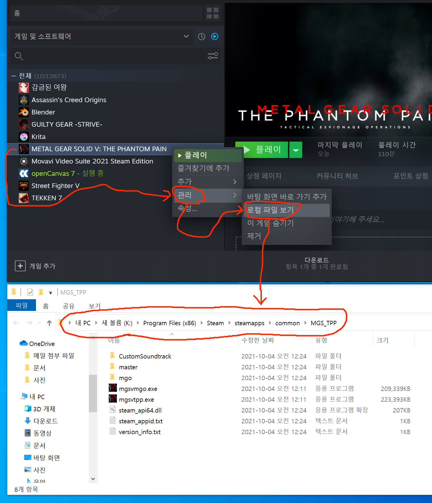 4. 다운로드 받은 파일을 C:\Program Files (x86)\Steam\steamapps\common\MGS_TPP\master에 덮어씌우시면