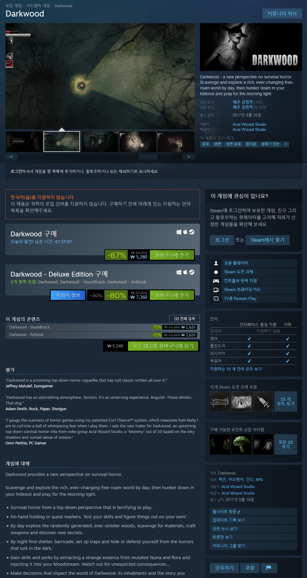 다크우드, 2D 탑뷰형식 로그라이크 호러 게임이며 아직 알파단계인지라 약간의 버그와 미완성으로 보이는 면이 여럿 있지만, 완성도는 비교적 좋은 편이다. 방사능으로 피폭된 어두운 숲에서 물건을 모으고 집을 개조하여 살아남아야 하는 게임인 다크우드는, 기본적으로 매우 하드코어하다. 플레이어에게 처음으로 주어지는 건 하나도 없으며, 인벤토리, 맵, 아이템... 어떤 면에서든 자비없음이 무엇인지를 보여준다. 인벤토리는 그리 크지 않아서 필요한 아이템들을 모두 주워가기에는 부족하고 불편하게 느껴진다. 맵은 대략적으로만 표기될 뿐, 나머지는 플레이어의 기억력과 방향감각에 의존해야하며, 필요한 아이템은 정말 한두가지가 아닌데, 기본적인 무기조차도 구하기 쉽지 않고, 다른 NPC와의 교환 가격도 꽤나 비싸 아이템을 구하는데에 있어서도 꽤나 애로사항이 많다. 이렇듯, 다크우드는 정말 플레이어에게 일말의 배려라는 게 없는 게임이다. 이 하드코어한 게임의 구성은 플레이어간의 취향을 강하게 타고, 호불호가 갈리기 쉬운 편이므로 구매 직전에 플레이 영상을 조금 보도록 하는 걸 추천한다.