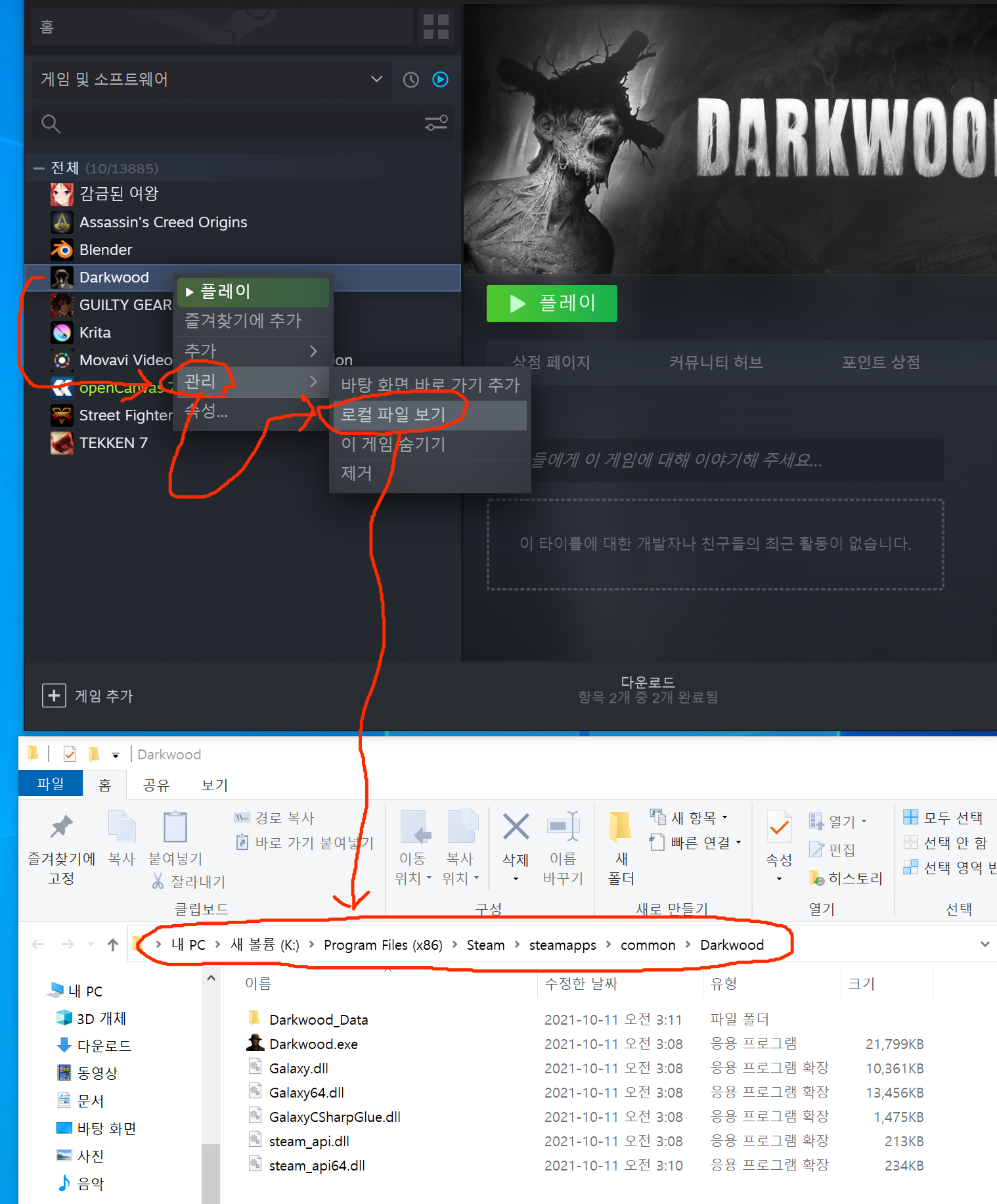 오른쪽 클릭후 "관리->로컬 파일 보기" 를 눌러주면 해당 설치된 폴더가 나옵니다.
