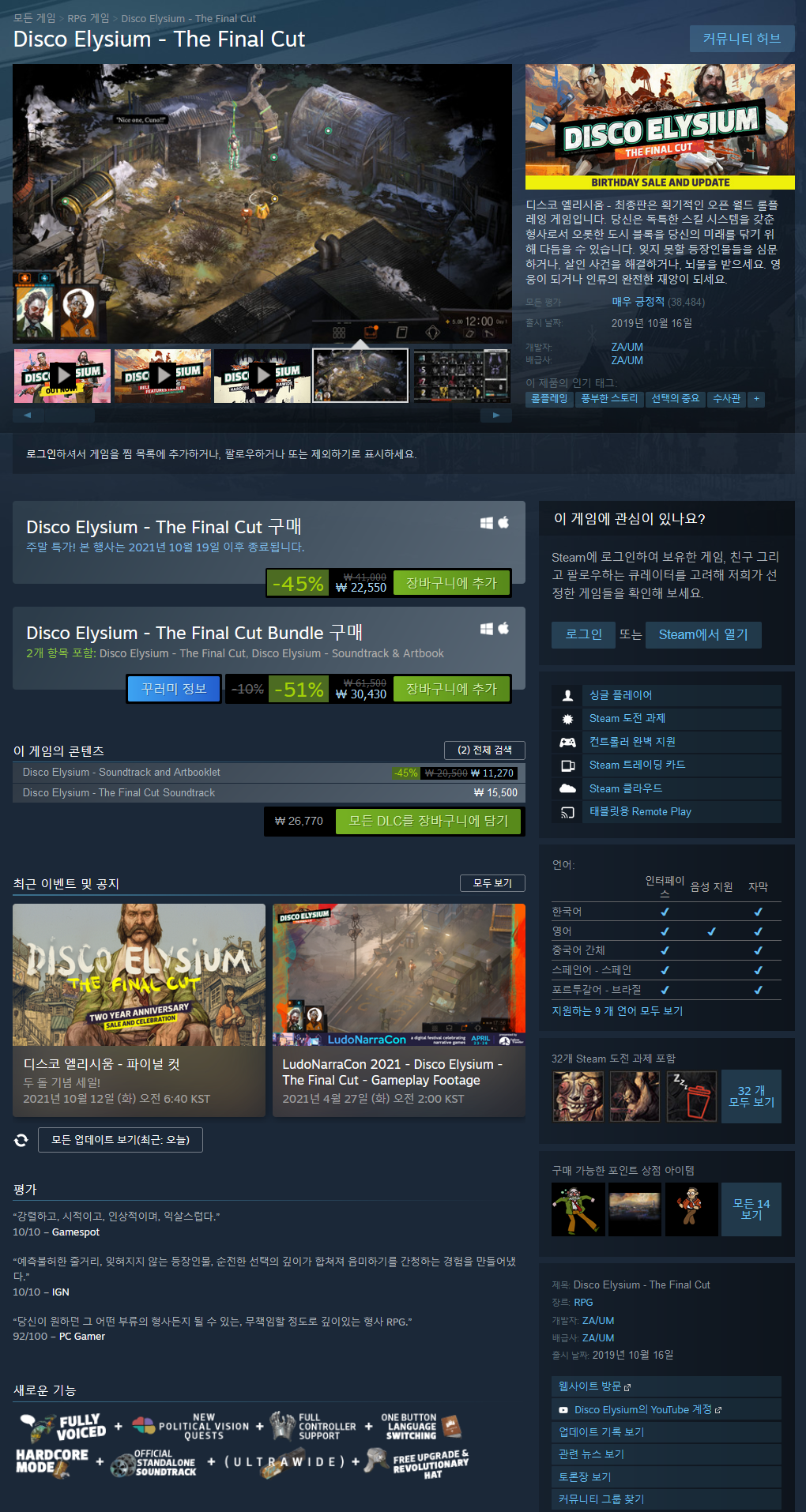 디스코 엘리시움 - 최종판은 획기적인 롤플레잉 게임의 결정판입니다. 당신은 독특한 스킬 시스템을 갖춘 형사로서 온 도시 블록을 당신의 미래를 닦기 위해 다듬을 수 있습니다. 잊지 못할 등장인물들을 심문하거나, 살인 사건을 해결하거나, 뇌물을 받으세요. 영웅이 되거나 인류의 완전한 재앙이 되세요.