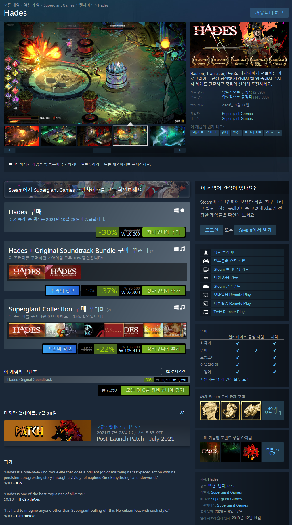 Hades는 Supergiant의 호평을 받았던 전작들에서 장점만 가져온 로그라이크 던전 탐색형 게임입니다. Bastion의 빠른 액션과 Transistor의 풍부한 분위기 및 깊이, Pyre의 캐릭터 중심 스토리텔링이 한 작품에 담겼습니다.