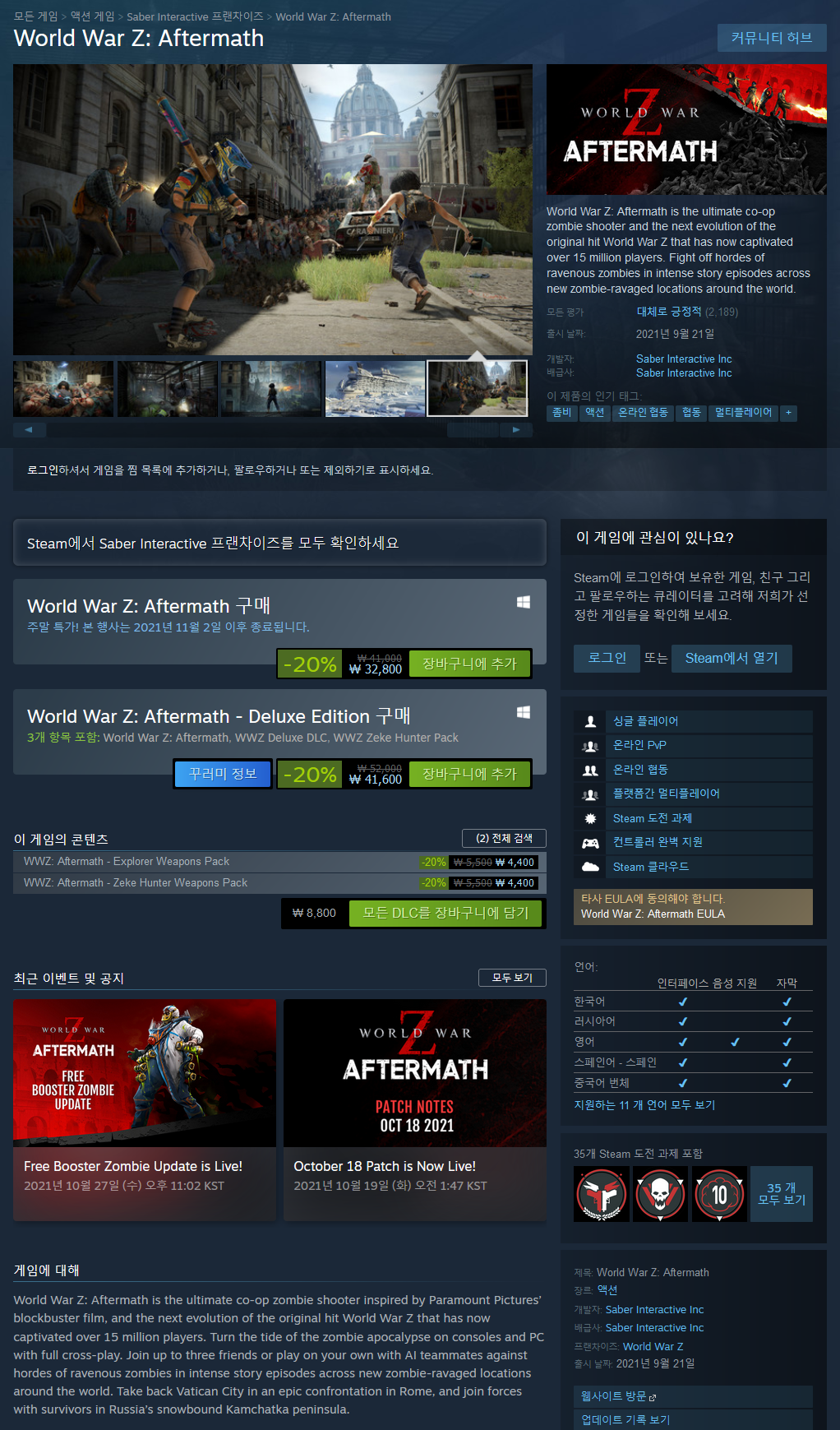 World War Z: Aftermath는 Paramount Pictures의 블록버스터 영화에서 영감을 받은 최고의 협동 좀비 슈팅 게임으로, 현재 1,500만 명이 넘는 플레이어를 사로잡은 오리지널 히트작 World War Z의 차세대 버전입니다. 완전한 크로스 플레이로 콘솔과 PC에서 좀비 종말의 조수를 바꾸십시오. 최대 3명의 친구와 함께하거나 AI 팀원과 함께 혼자서 플레이하여 전 세계의 새로운 좀비로 황폐화된 지역에서 펼쳐지는 강렬한 스토리 에피소드에서 굶주린 좀비 무리에 맞서 싸우십시오. 로마의 장대한 대결에서 바티칸 시국을 되찾고 러시아의 눈 덮인 캄차카 반도에서 생존자들과 힘을 합치십시오.