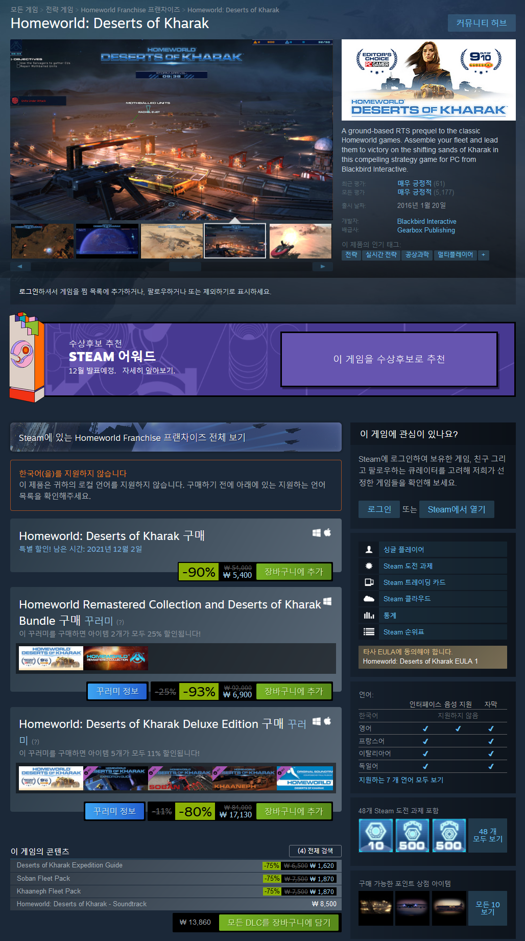 클래식 홈월드 게임의 지상 기반 RTS 프리퀄입니다. 이 매력적인 전략 게임에서 함대를 구성하고 변화하는 Kharak의 모래에서 승리로 이끄십시오. Homeworld와 Company of Heroes의 베테랑들이 설립한 스튜디오인 Blackbird Interactive가 제작한 Homeworld: Deserts of Kharak은 플레이어를 모든 모래 언덕에 위험이 도사리고 있는 Kharak의 사막으로 안내합니다.