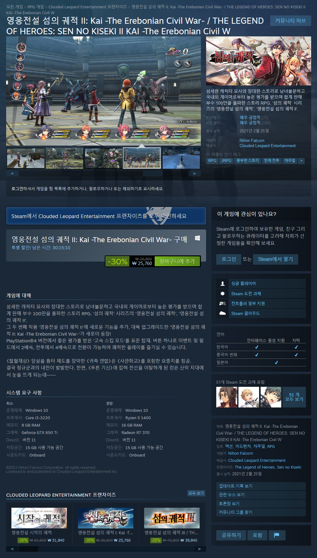 섬세한 캐릭터 묘사와 장대한 스토리로 남녀불문하고 국내외 게이머로부터 높은 평가를 받으며 합계 판매 부수 100만을 돌파한 스토리 RPG, ‘섬의 궤적’ 시리즈의 '영웅전설 섬의 궤적’, ’영웅전설 섬의 궤적 II’.