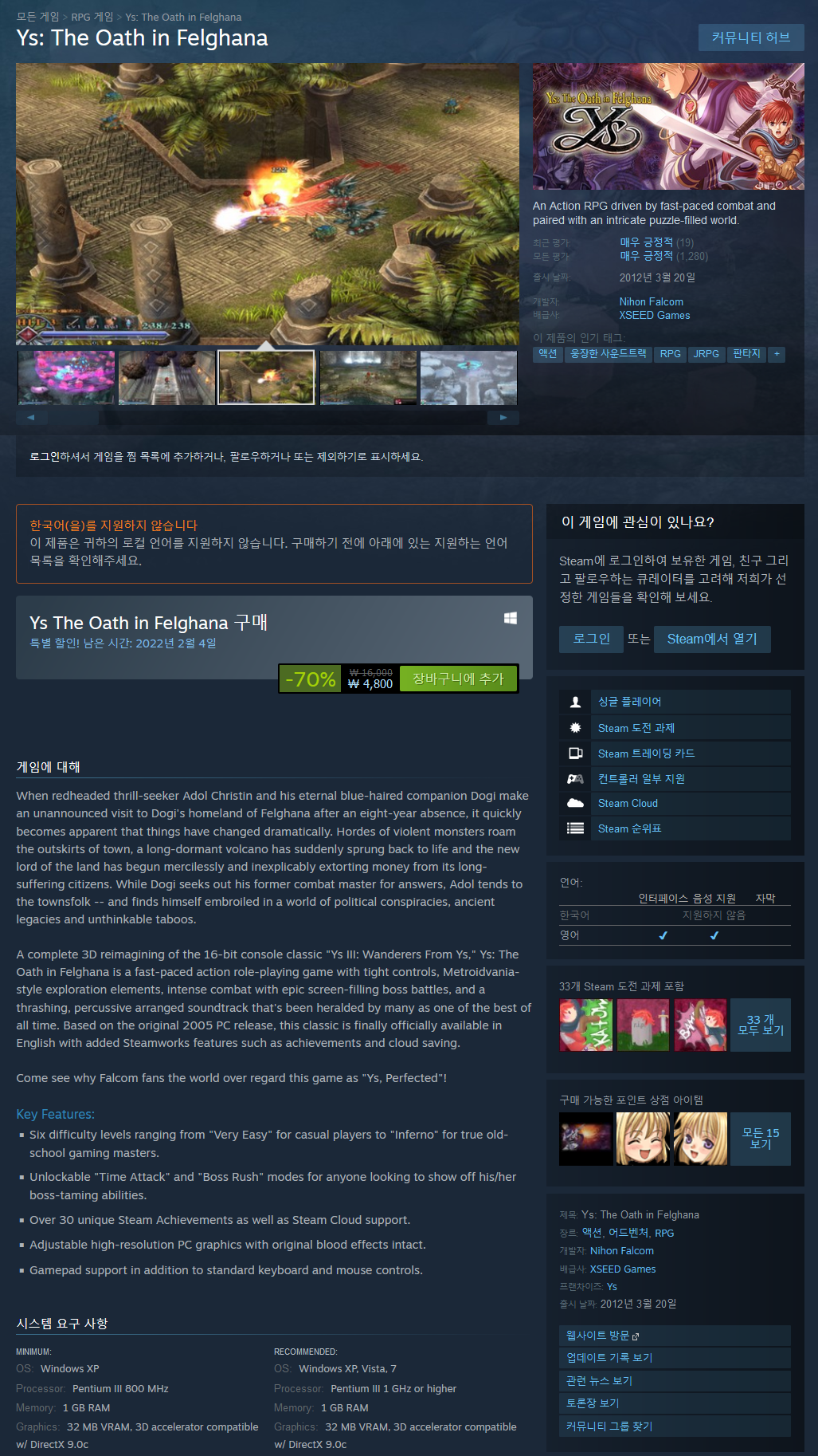16비트 콘솔 클래식 "Ys III: Wanderers From Ys"를 완전히 3D로 재해석한 Ys: The Oath in Felghana는 엄격한 컨트롤, Metroidvania 스타일 탐험 요소, 서사시와 함께 강렬한 전투가 포함된 빠르게 진행되는 액션 롤플레잉 게임입니다. 화면을 가득 채우는 보스 전투, 그리고 많은 사람들이 역대 최고 중 하나로 예고한 충격적이고 충격적인 배열된 사운드트랙. 오리지널 2005 PC 릴리스를 기반으로 한 이 고전은 마침내 공식적으로 영어로 제공되며 업적 및 클라우드 저장과 같은 Steamworks 기능이 추가되었습니다.