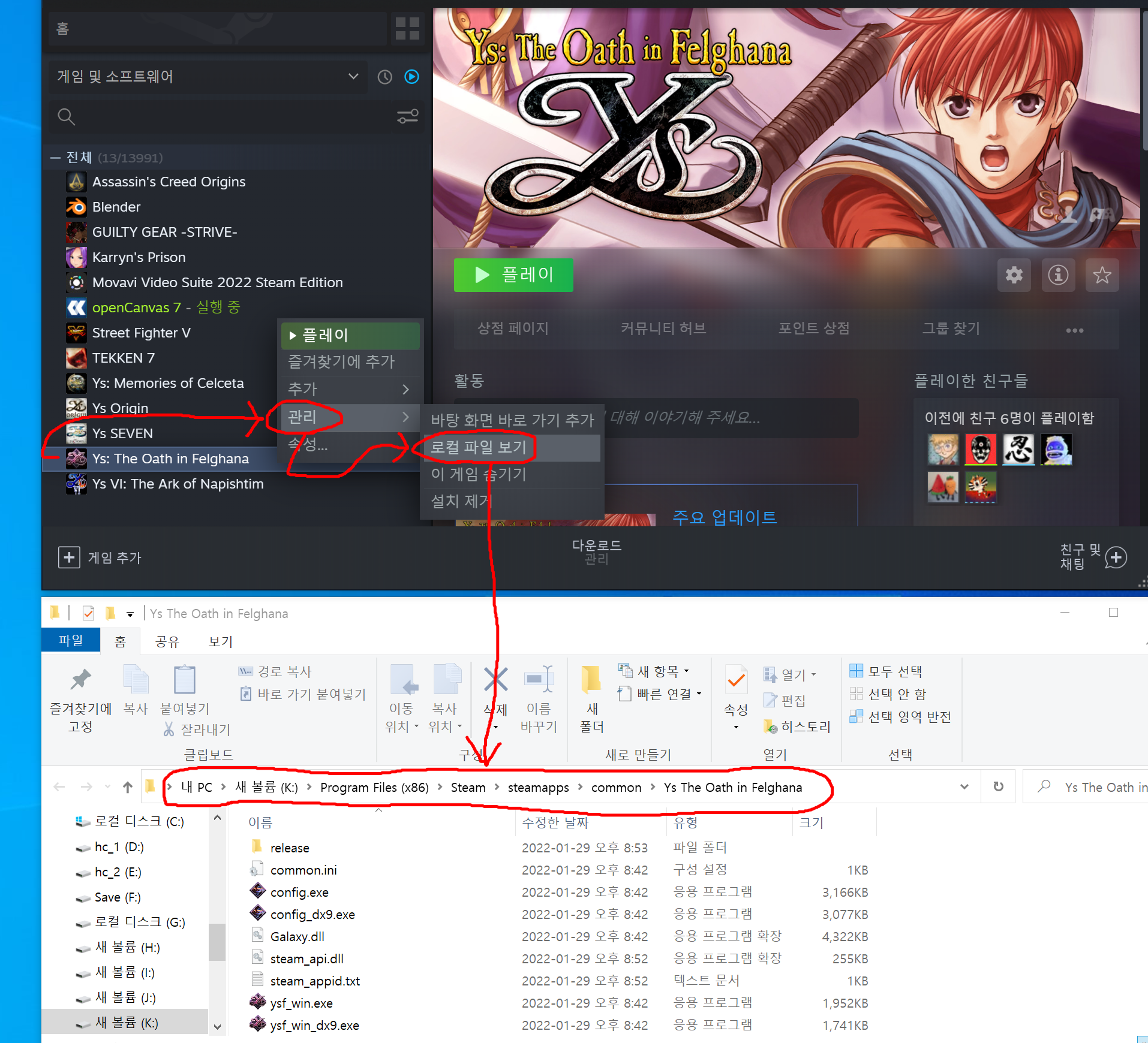 오른쪽 클릭후 "관리->로컬 파일 보기" 를 눌러주면 해당 설치된 폴더가 나옵니다.