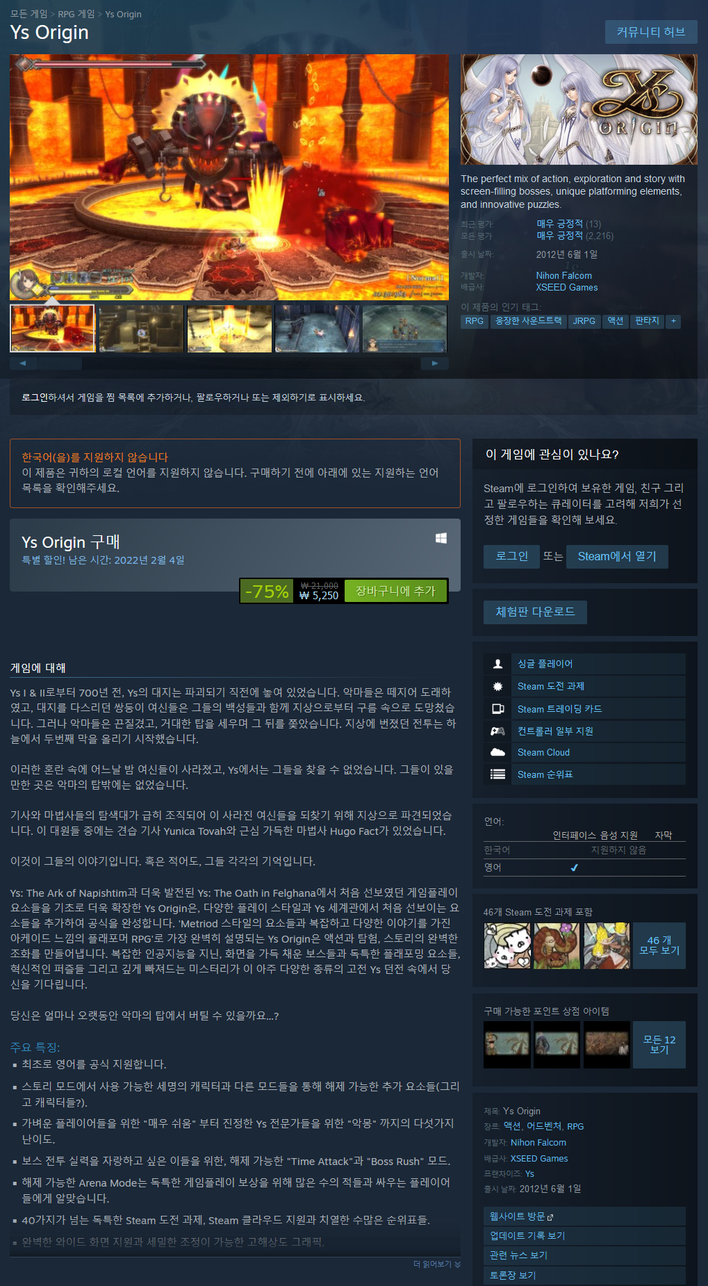 Ys: The Ark of Napishtim과 더욱 발전된 Ys: The Oath in Felghana에서 처음 선보였던 게임플레이 요소들을 기초로 더욱 확장한 Ys Origin은, 다양한 플레이 스타일과 Ys 세계관에서 처음 선보이는 요소들을 추가하여 공식을 완성합니다. 'Metriod 스타일의 요소들과 복잡하고 다양한 이야기를 가진 아케이드 느낌의 플래포머 RPG'로 가장 완벽히 설명되는 Ys Origin은 액션과 탐험, 스토리의 완벽한 조화를 만들어냅니다. 복잡한 인공지능을 지닌, 화면을 가득 채운 보스들과 독특한 플래포밍 요소들, 혁신적인 퍼즐들 그리고 깊게 빠져드는 미스터리가 이 아주 다양한 종류의 고전 Ys 던전 속에서 당신을 기다립니다.