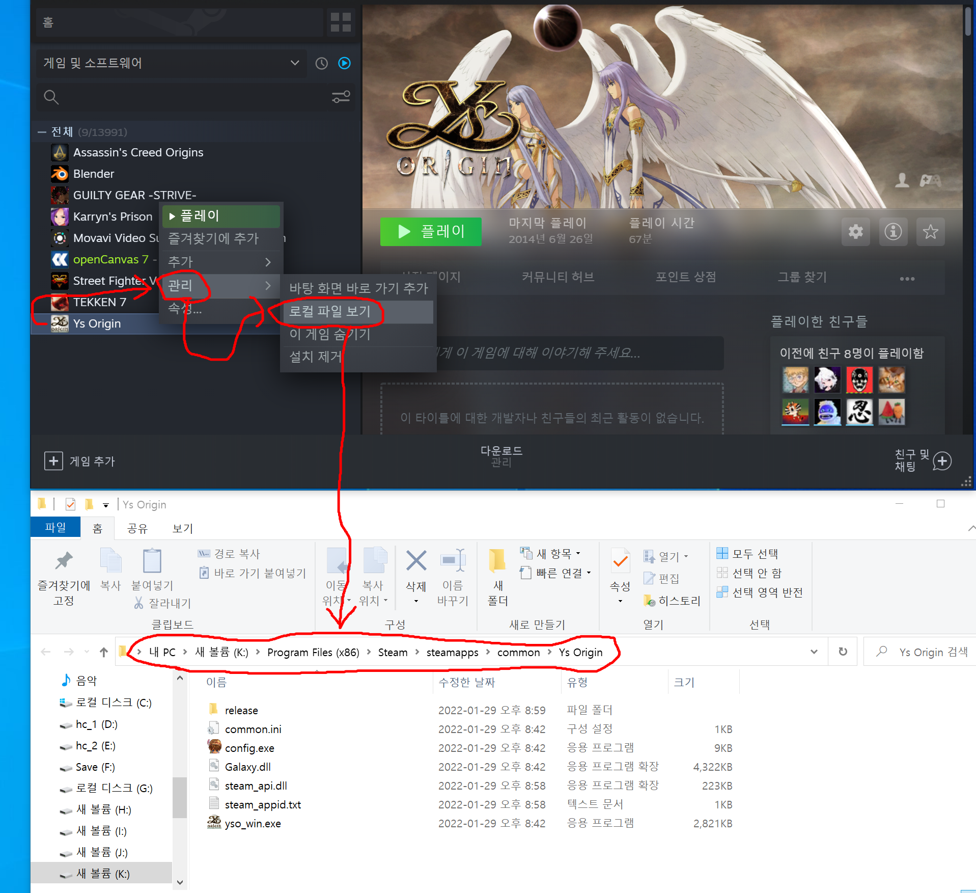 오른쪽 클릭후 "관리->로컬 파일 보기" 를 눌러주면 해당 설치된 폴더가 나옵니다.