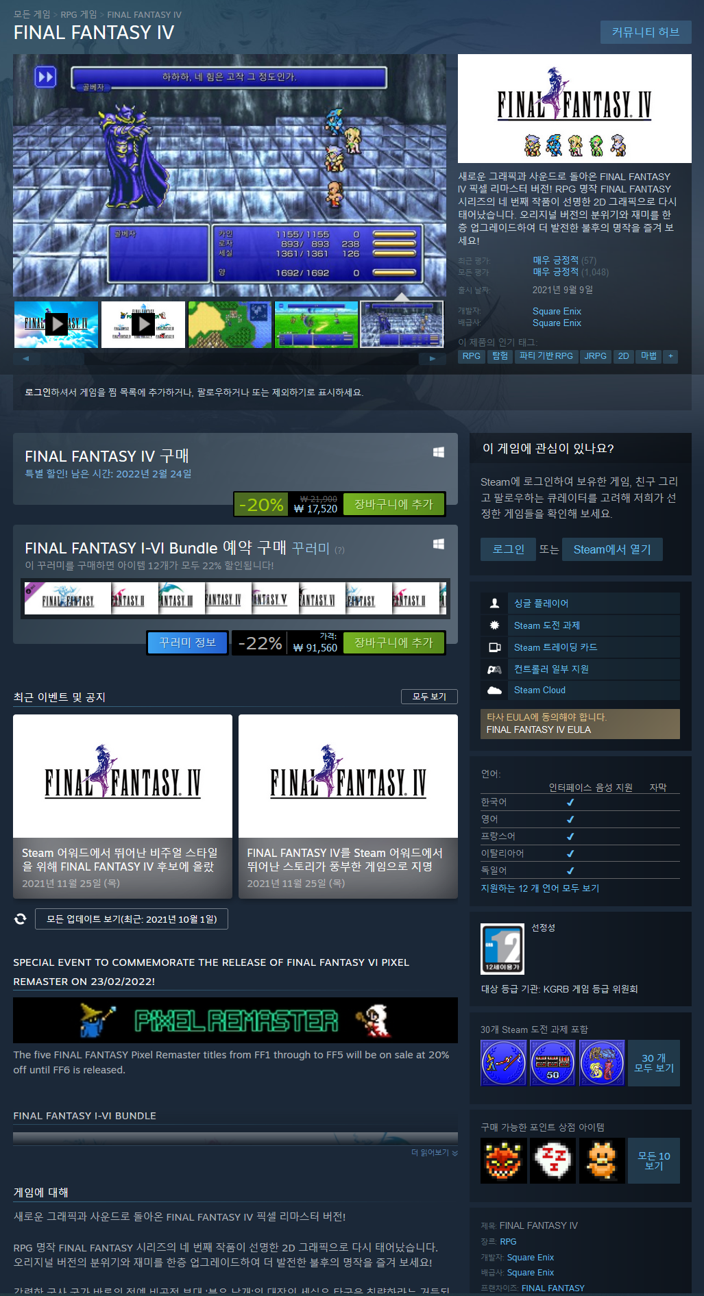 새로운 그래픽과 사운드로 돌아온 FINAL FANTASY IV 픽셀 리마스터 버전!