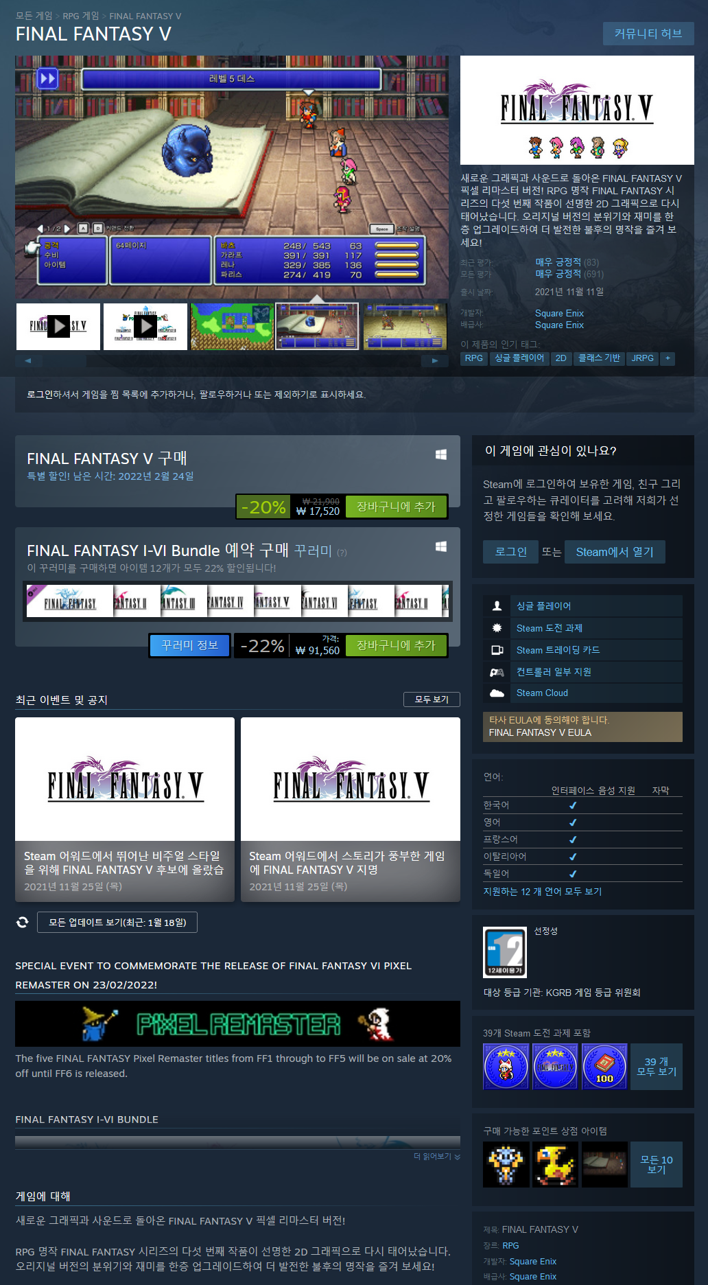 새로운 그래픽과 사운드로 돌아온 FINAL FANTASY V 픽셀 리마스터 버전!