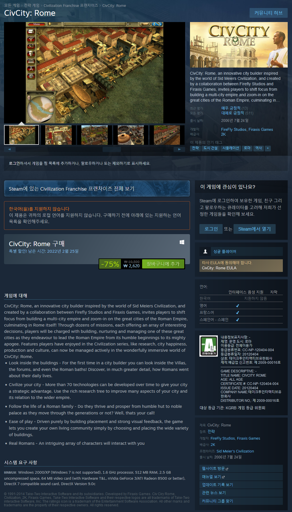 CivCity: Rome은 Sid Meiers Civilization의 세계에서 영감을 받고 Firefly Studios와 Firaxis Games의 협력으로 탄생한 혁신적인 도시 건설업체로서 플레이어가 다중 도시 제국 건설에서 벗어나 대도시를 확대할 수 있도록 초대합니다. 로마 제국, 로마 그 자체에서 절정! 각각 흥미로운 결정을 제공하는 수십 개의 미션을 통해 플레이어는 로마 제국을 겸손한 시작에서 강력한 전성기로 이끌기 위해 노력하면서 이 위대한 도시 중 하나를 건설, 육성 및 관리해야 합니다. 플레이어가 Civilization 시리즈에서 즐겼던 연구, 도시 행복, 생산 및 문화와 같은 기능을 이제 CivCity: Rome의 놀랍도록 몰입감 넘치는 세계에서 적극적으로 관리할 수 있습니다.