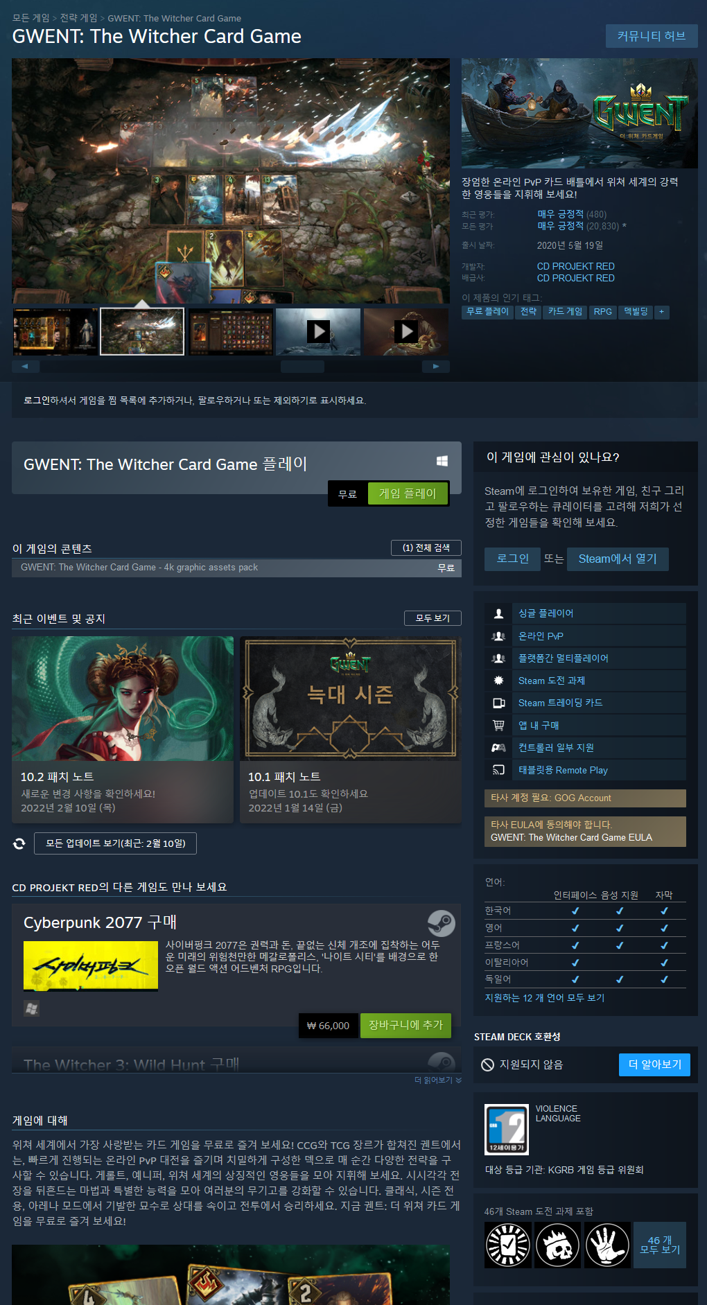 위쳐 세계에서 가장 사랑받는 카드 게임을 무료로 즐겨 보세요! CCG와 TCG 장르가 합쳐진 궨트에서는, 빠르게 진행되는 온라인 PvP 대전을 즐기며 치밀하게 구성한 덱으로 매 순간 다양한 전략을 구사할 수 있습니다. 게롤트, 예니퍼, 위쳐 세계의 상징적인 영웅들을 모아 지휘해 보세요. 시시각각 전장을 뒤흔드는 마법과 특별한 능력을 모아 여러분의 무기고를 강화할 수 있습니다. 클래식, 시즌 전용, 아레나 모드에서 기발한 묘수로 상대를 속이고 전투에서 승리하세요. 지금 궨트: 더 위쳐 카드 게임을 무료로 즐겨 보세요!
