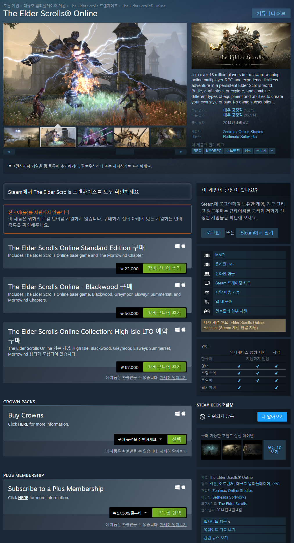 그 이외에도 언어의 장벽도 있을 수 있다. 물론 유저제작 패치가 있어서 한국어로 즐기고 싶으면 패치를 해야 하는데 그냥 폴더 복붙이 아니라 "애드온' 이라는 개념을 또 알아야 하는데 패치 과정이 살짝 복잡할 수도 있다. 그래도 공략 사이트가 존재는 해서 얼추 따라할 수는 있다. ESOUI 등의 도움이 되는 사이트들이 많이 있으나 영문 사이트인데다가 이런 류의 애드온 적용 MMORPG를 접한 유저들이 없다면 약간 애를 먹을 가능성이 있을 것이라 생각한다. 21년 6월에 무슨 사건 있어서 한패팀이 터졌다던데 그건 난 잘 모르겠지만 여튼 유감이다. 그럼에도 최신 DLC를 제외하면 앵간한 것들은 다 번역이 되어 있을 것이므로 큰 문제는 없을 것.