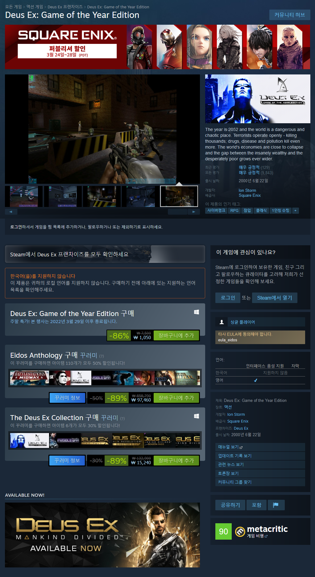 최고의 게임! FPS와 RPG의 완벽한 조합! 오픈 월드 게임도 아닌데 싱글플레이만 수십시간 플레이하게 만드는 놀라운 게임! 지금 기준으로 보면 분명 그래픽도 별로고, 음모론을 노골적으로 섞어놓은 스토리도 어색해 보일지도 모르지만, 한명도 안죽이고 잠입을 하던, 눈에 보이는걸 전부 죽이고, 박살내는 괴물이 되건 정말 플레이어의 선택에 따라 가능한 야심찬 게임 디자인은 여전히 이 게임을 돋보이게 만든다.