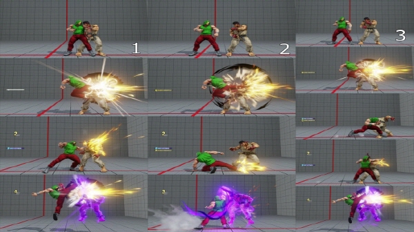 | 중펀치 2타 히트 이후에는 트리거를 느린 탄속으로 중펀이후에 캔슬을 약간 느리게 쓰고 대쉬후에 약펀치후 라이징을 넣으면 캐논이 3타가 남게 되고 이후 대쉬 2번후에 다시 압박 상황을 만드는것도 좋습니다. |