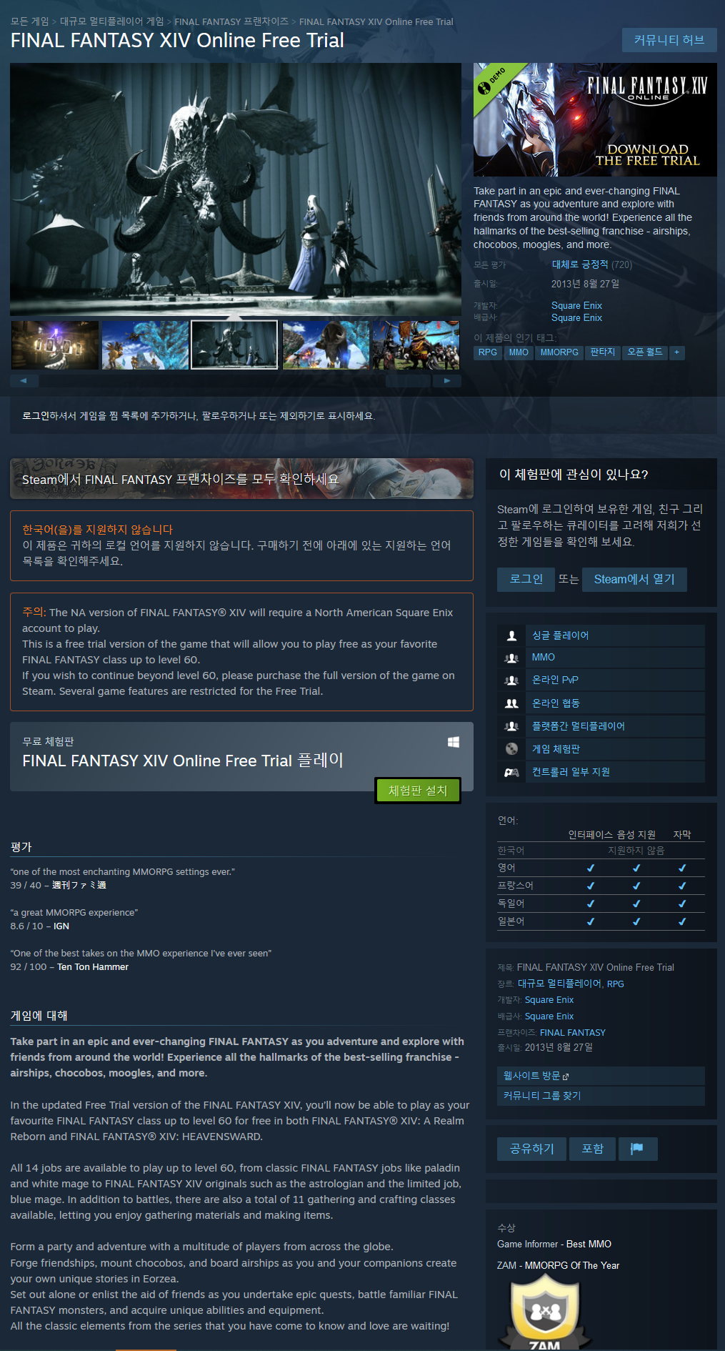 한국 유저가 즐기기 위해서는 로그인시 VPN 우회, 언어의 장벽, 서버 폭발시의 약간의 핑테러, 패키지 구매형 mmo + 월정액의 낮지 않은 산맥이 버티고 있다. 하지만 현실적인 마이너스 요소를 포함하더라도 꼭 한번쯤은 플레이 해봐도 될 잘 만들어진 게임이라고 생각한다.