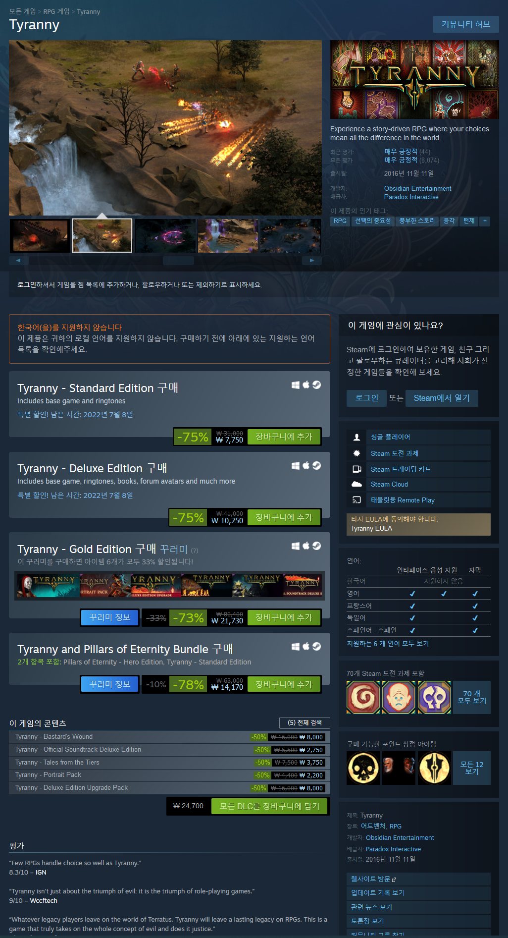 짧고 굵은 선형 스토리는 반전과 충격이 중요하지만 티러니는 내가 선택하는 대로 이야기가 흘러가기 때문에 내 선택이 가져올 결과를 쉽게 예측할 수 있고, 그래서 예상치 못한 극적인 사건은 별로 없다. 그 안에서 다양한 등장인물이 정교하게 빚어내는 갈등을 감상하면 된다.