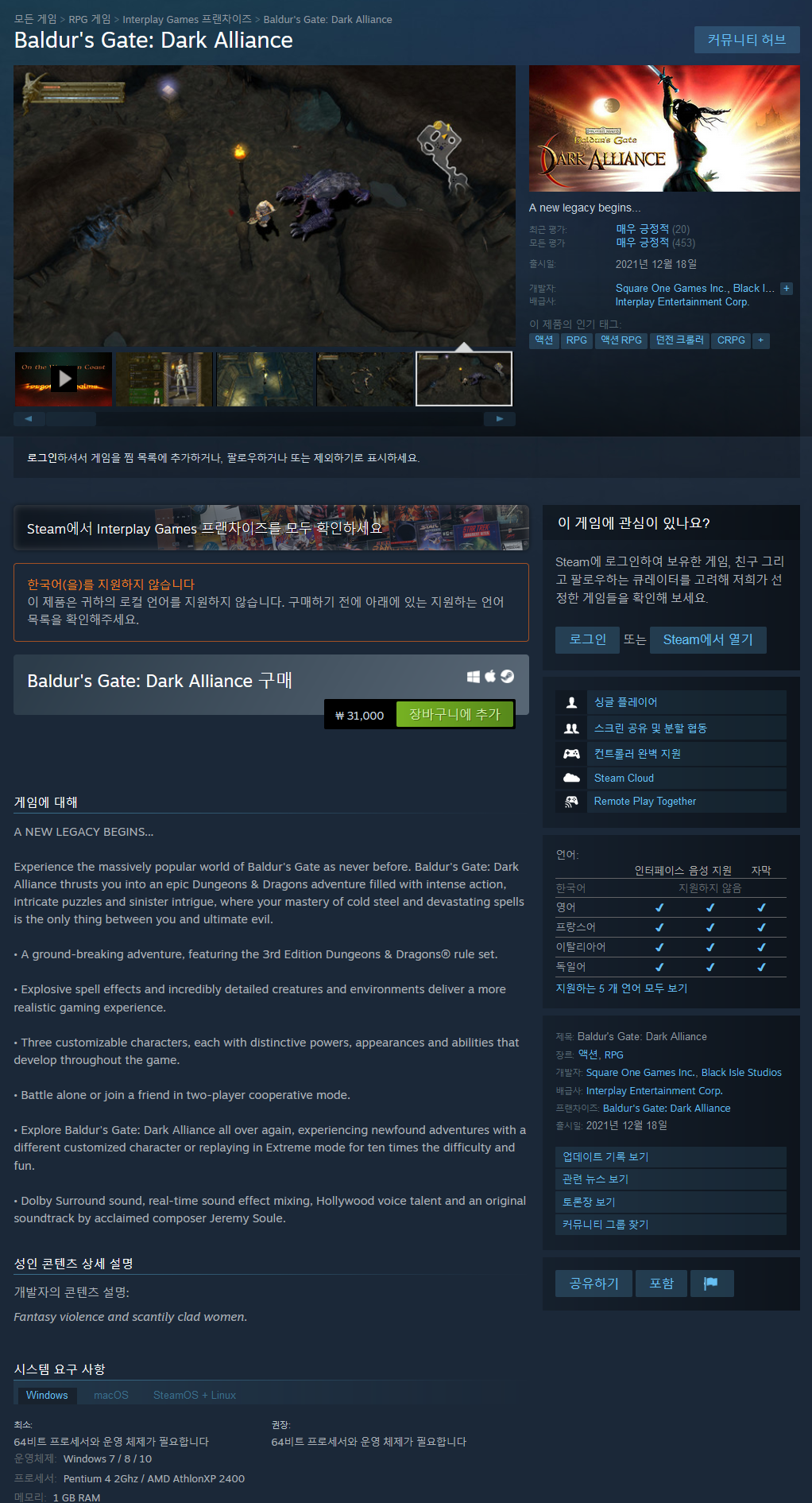 지금까지 경험하지 못한 엄청난 인기를 자랑하는 Baldur's Gate의 세계를 경험하십시오. Baldur's Gate: Dark Alliance는 강렬한 액션, 복잡한 퍼즐, 사악한 음모로 가득 찬 장대한 Dungeons & Dragons 모험으로 당신을 몰아넣습니다. 그곳에서 차가운 강철과 파괴적인 주문에 대한 숙달만이 당신과 궁극의 악 사이에 유일한 존재입니다.