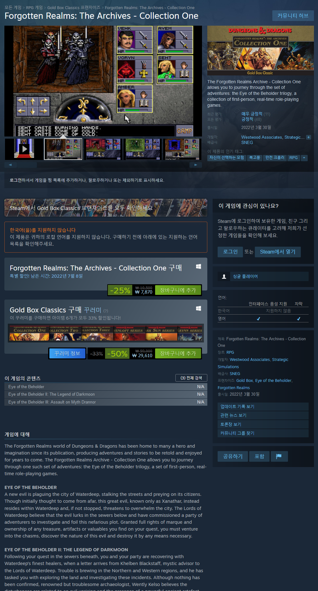 Dungeons & Dragons의 Forgotten Realms 세계는 출시 이후 많은 영웅과 상상력의 고향이었으며, 앞으로 몇 년 동안 다시 말하고 즐길 수 있는 모험과 이야기를 만들어냅니다. Forgotten Realms Archive - Collection One에서는 1인칭 실시간 롤플레잉 게임인 Eye of the Beholder 3부작과 같은 일련의 모험을 여행할 수 있습니다.