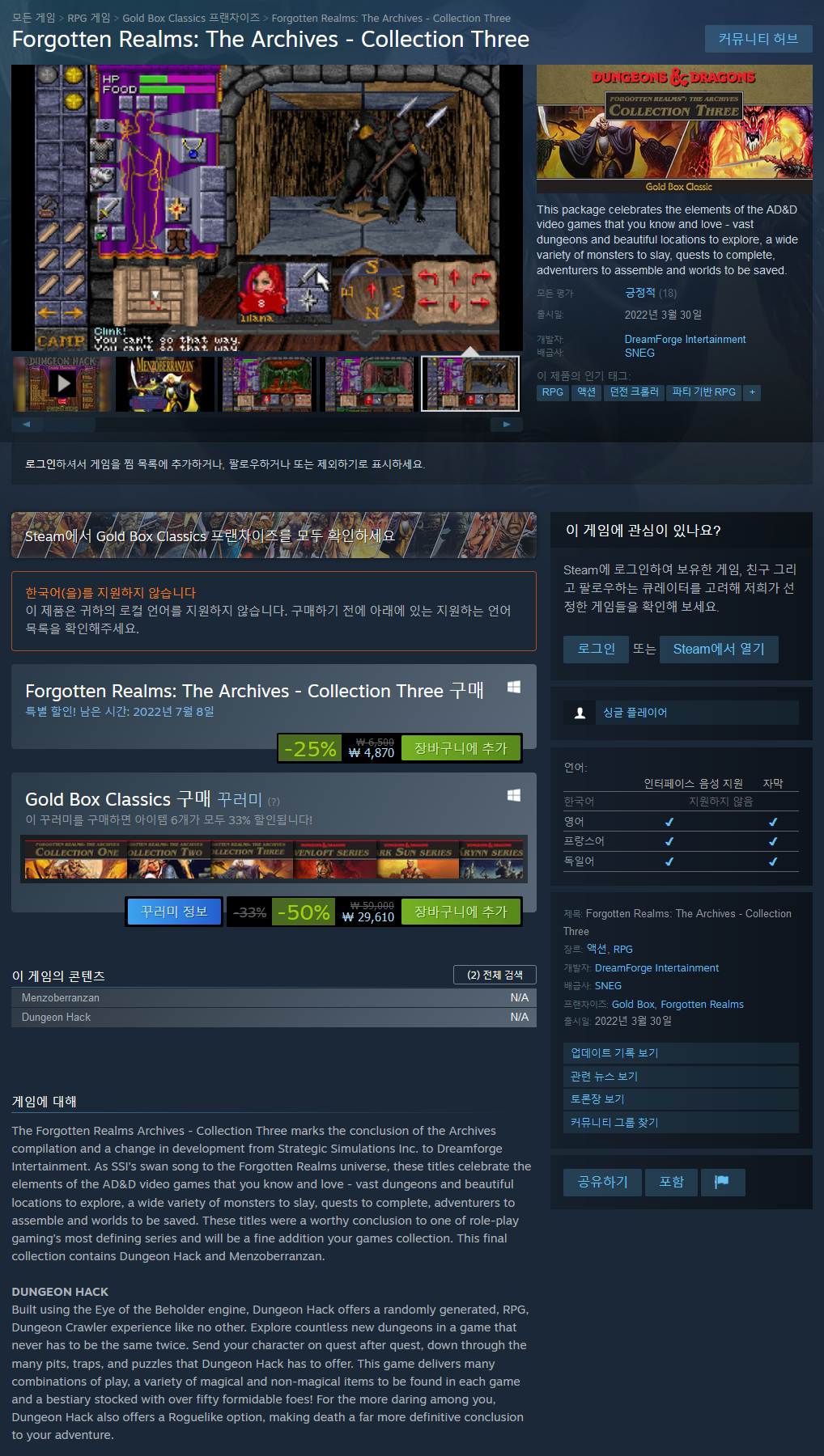 Forgotten Realms Archives - Collection Three는 아카이브 편집의 끝이자 Strategic Simulations Inc.에서 Dreamforge Intertainment로의 개발 변경 사항을 표시합니다. Forgotten Realms 세계에 대한 SSI의 백조 노래인 이 타이틀은 여러분이 알고 사랑하는 AD&D 비디오 게임의 요소를 기념합니다. 탐험할 광대한 던전과 아름다운 장소, 처치할 다양한 몬스터, 완료해야 할 퀘스트, 모을 수 있는 모험가 및 구해야 할 세계. 이 타이틀은 롤플레잉 게임의 가장 정의적인 시리즈 중 하나에 대한 가치 있는 결론이었고 게임 컬렉션에 훌륭한 추가가 될 것입니다. 이 최종 컬렉션에는 Dungeon Hack과 Menzoberranzan이 포함되어 있습니다.