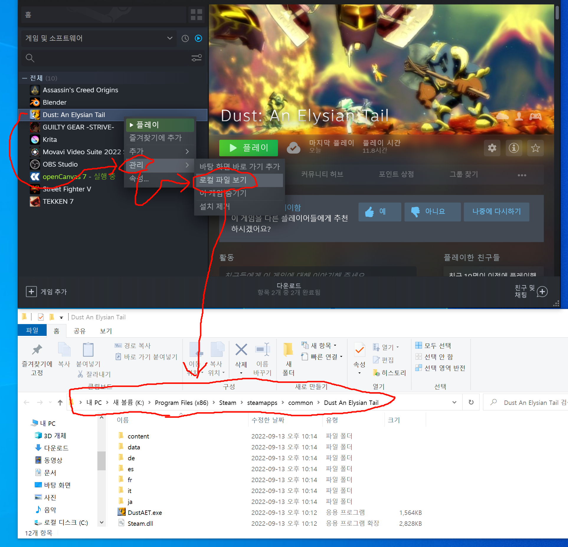 오른쪽 클릭후 "관리->로컬 파일 보기" 를 눌러주면 해당 설치된 폴더가 나옵니다.