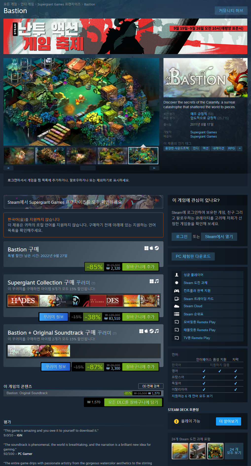 Bastion은 당신의 일거수일투족을 알려주며 반응하는 해설자가 스토리를 설명하는 액션 롤플레잉 게임입니다. 세상은 상상도 못할 재앙으로 인해 조각나버렸습니다. 재앙의 비밀을 찾아가며 손으로 정성스레 그려진 40개가 넘는 환경들을 탐험하십시오. 거대한 무기고의 강화 무기들을 휘둘러 새로운 서식지에 적응한 흉포한 짐승들과 싸우십시오. 메인 스토리를 완료했다면 뉴 게임 플러스 모드가 잠금 해제되어 당신의 여행을 계속하실 수 있게 됩니다!