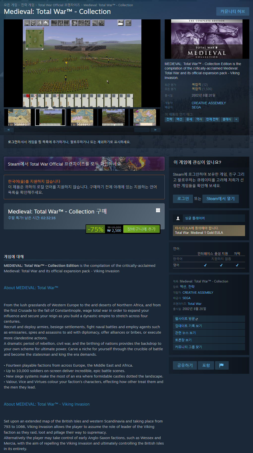 MEDIEVAL: Total War™ - Collection Edition is the compilation of the critically-acclaimed Medieval: Total War and its official expansion pack - Viking Invasion