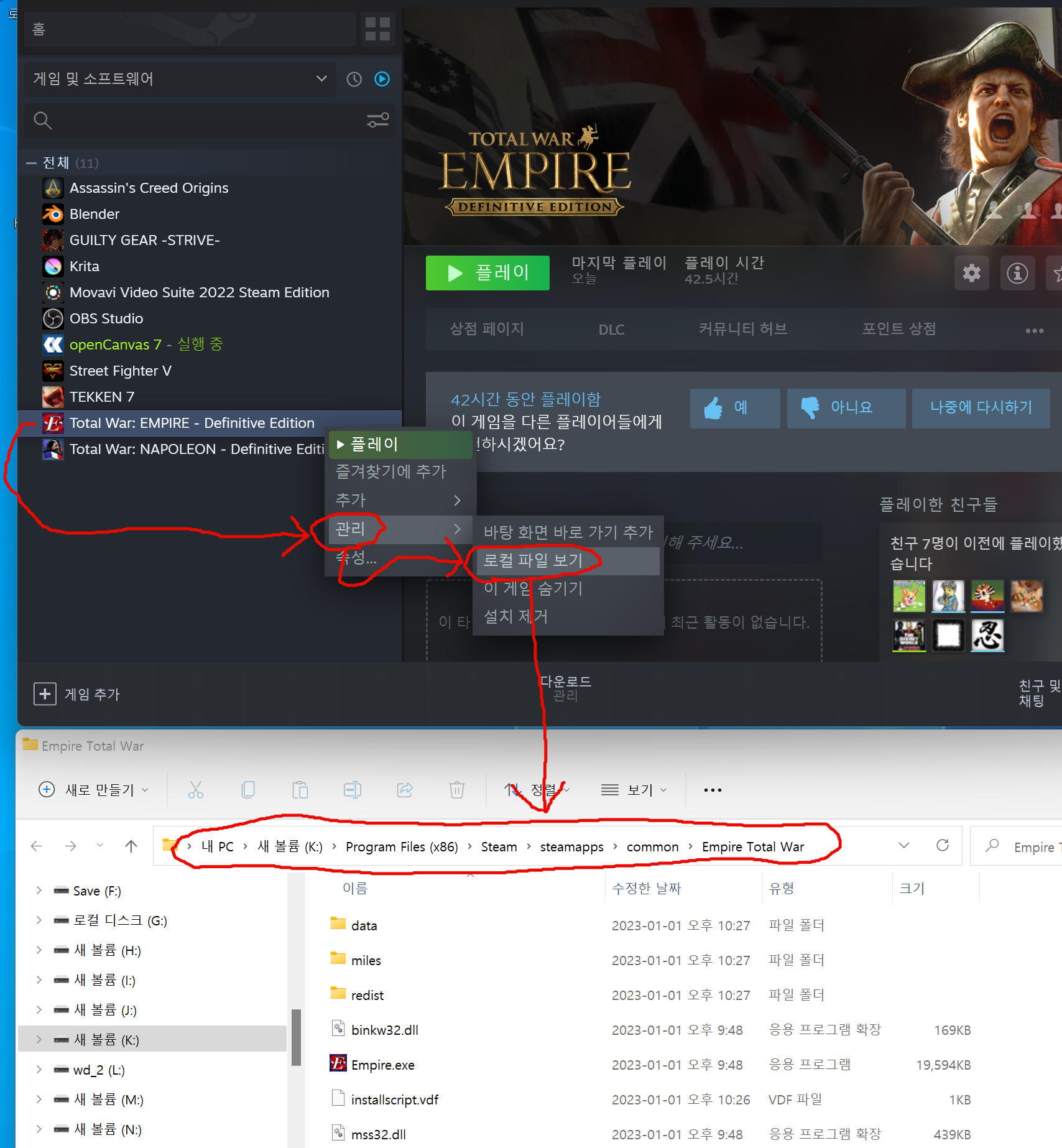 오른쪽 클릭후 "관리->로컬 파일 보기" 를 눌러주면 해당 설치된 폴더가 나옵니다.