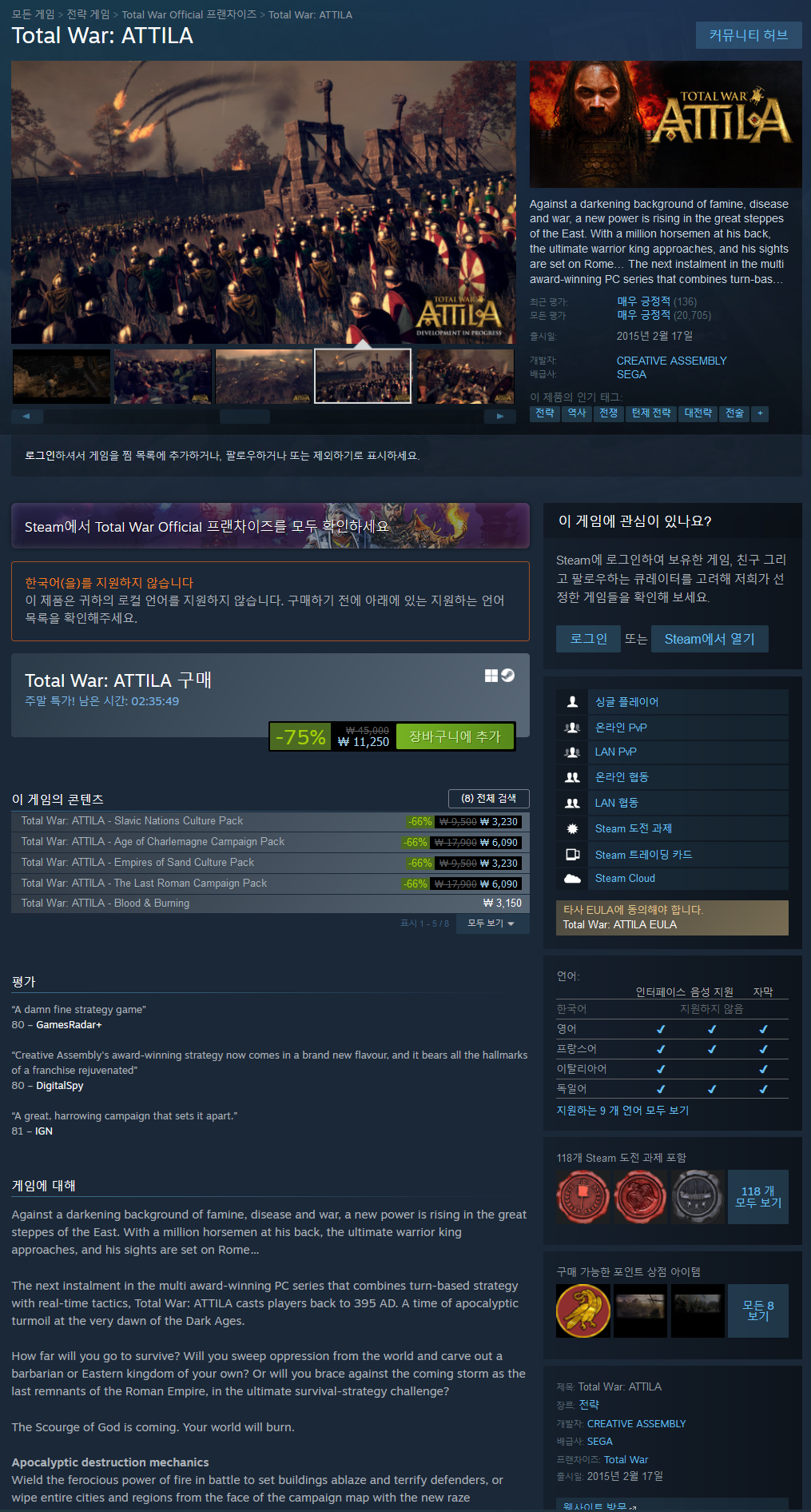 새로운 시대별 기술, 무기 및 군비, 종교, 문화 및 사회적 격변을 통해 Total War: ATTILA는 우리 역사의 이 불길한 장에 대한 진정한 경험을 제공합니다.