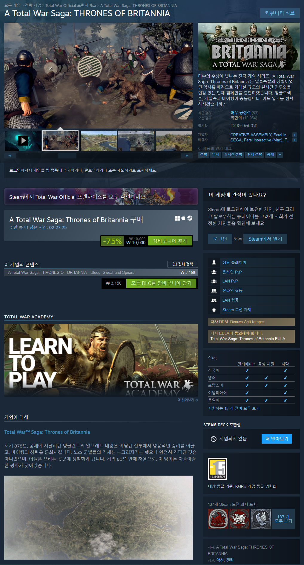 Thrones of Britannia is a standalone Total War game which will challenge you to re-write a critical moment in history, one that will come to define the future of modern Britain. With ten playable factions, you must build and defend a kingdom to the glory of Anglo-Saxons, Gaelic clans, Welsh tribes or Viking settlers. Forge alliances, manage burgeoning settlements, raise armies and embark on campaigns of conquest across the most detailed Total War map to date.