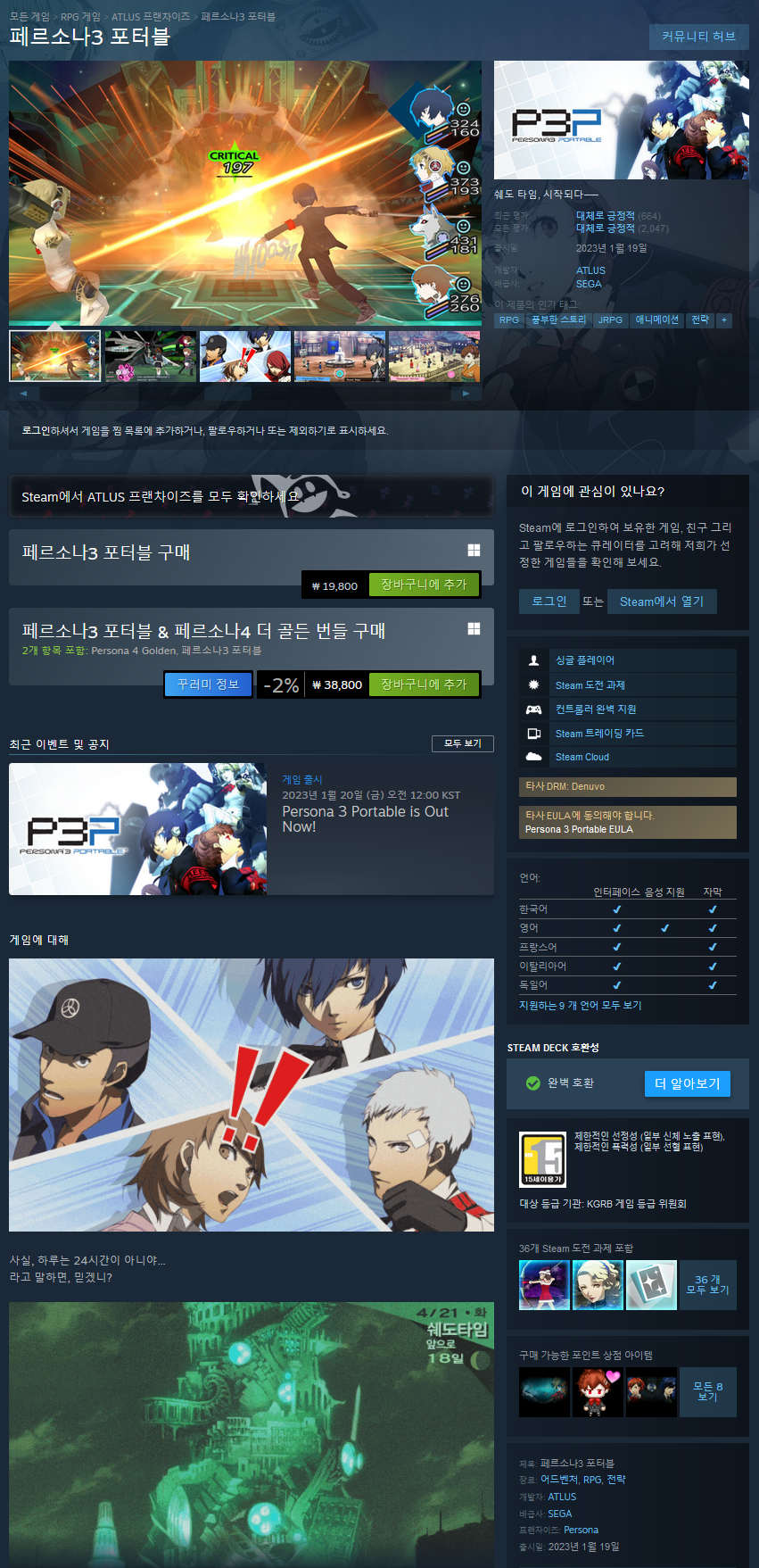 Jrpg 혹은 다른 페르소나 시리즈를 좋아하거나 3편에 추억을 갖고 있는 사람들을 제외하면 2023년이나 돼서 이 게임을 할 가치가 있을까 싶긴 하다. 몇년째 얘기만 나오는 리메이크라도 해주면 모를까