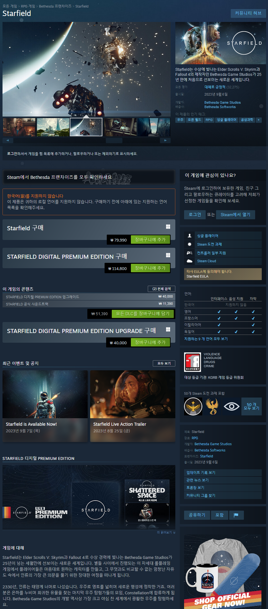 Starfield는 Elder Scrolls V: Skyrim과 Fallout 4로 수상 경력에 빛나는 Bethesda Game Studios가 25년이 넘는 세월만에 선보이는 새로운 세계입니다. 별들 사이에서 진행되는 이 차세대 롤플레잉 게임에서 플레이어들은 마음대로 원하는 캐릭터를 만들고, 그 무엇과도 비교할 수 없는 엄청난 자유도 속에서 인류의 가장 큰 의문을 풀기 위한 장대한 여정을 떠나게 됩니다.