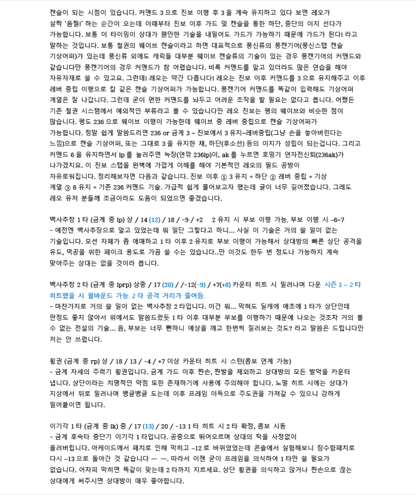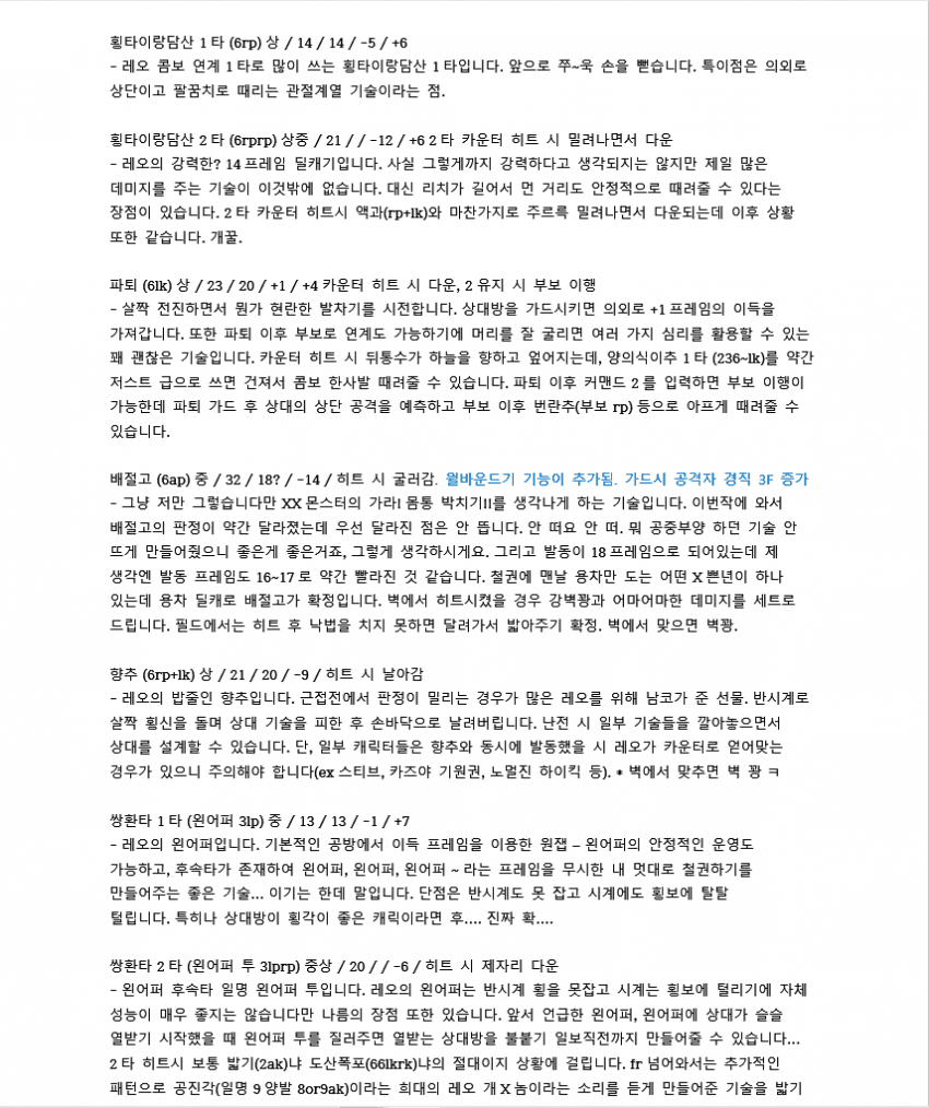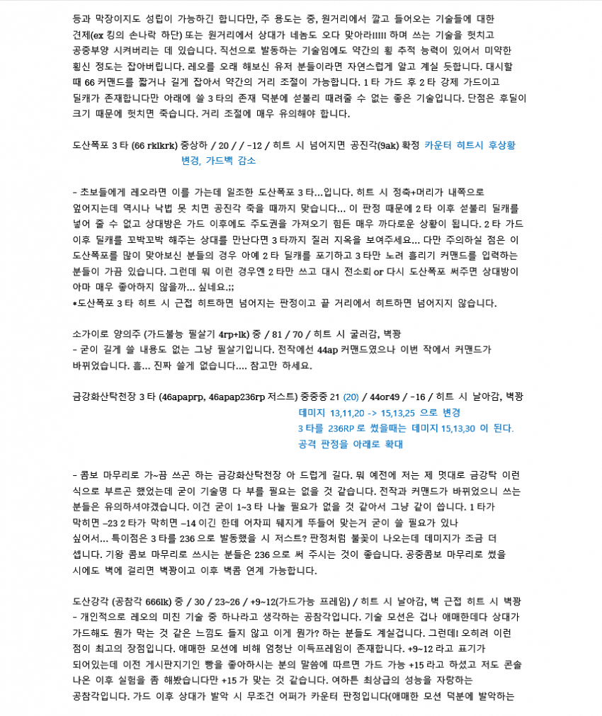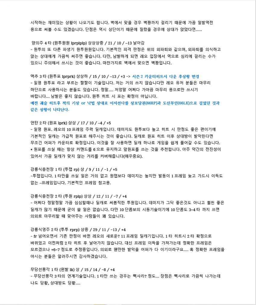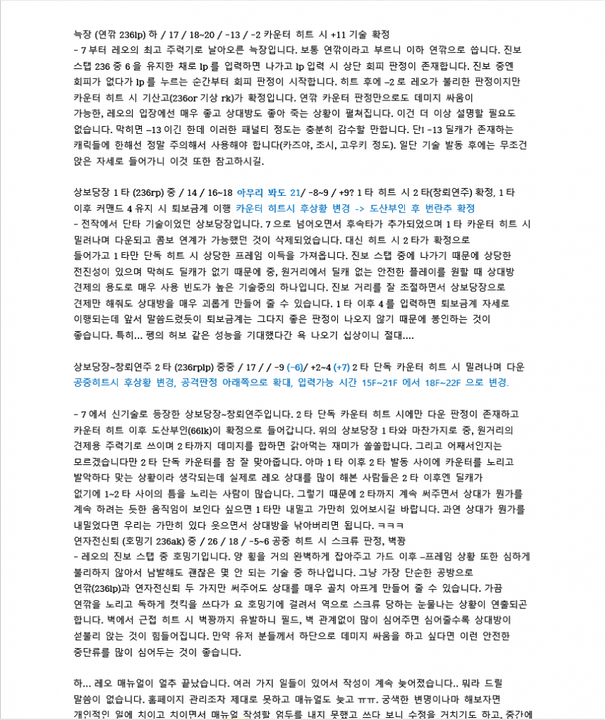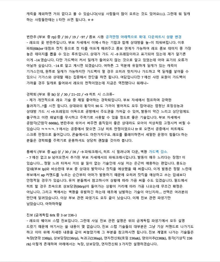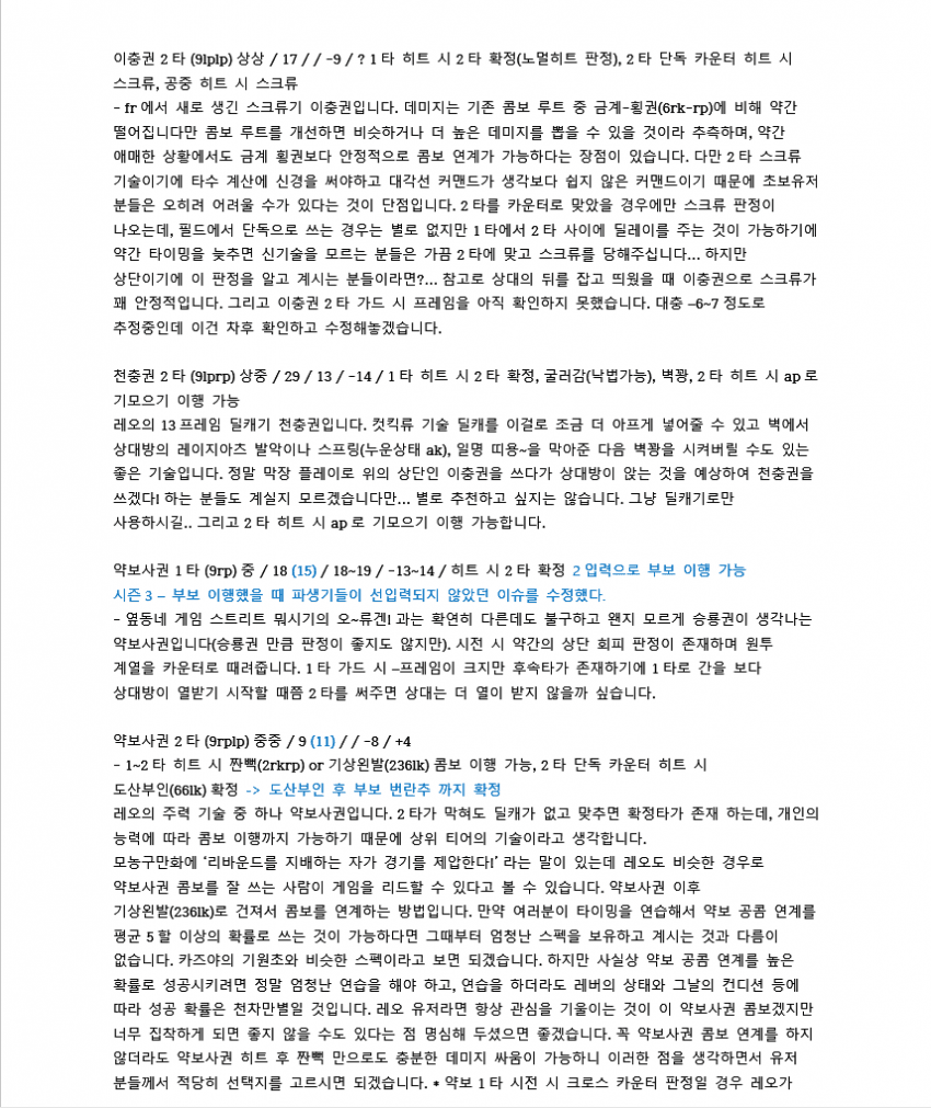 7이전에 벽콤으로 많이 쓰였던 루트입니다. 레오는 2rp 커맨드가 따로 있기 때문에 2를 먼저 입력한 후 rp를 눌러야 짠손이 나가요.