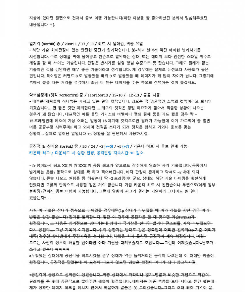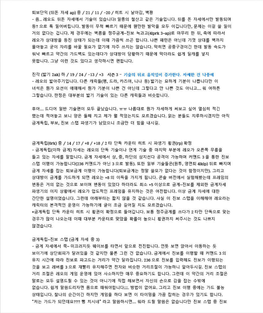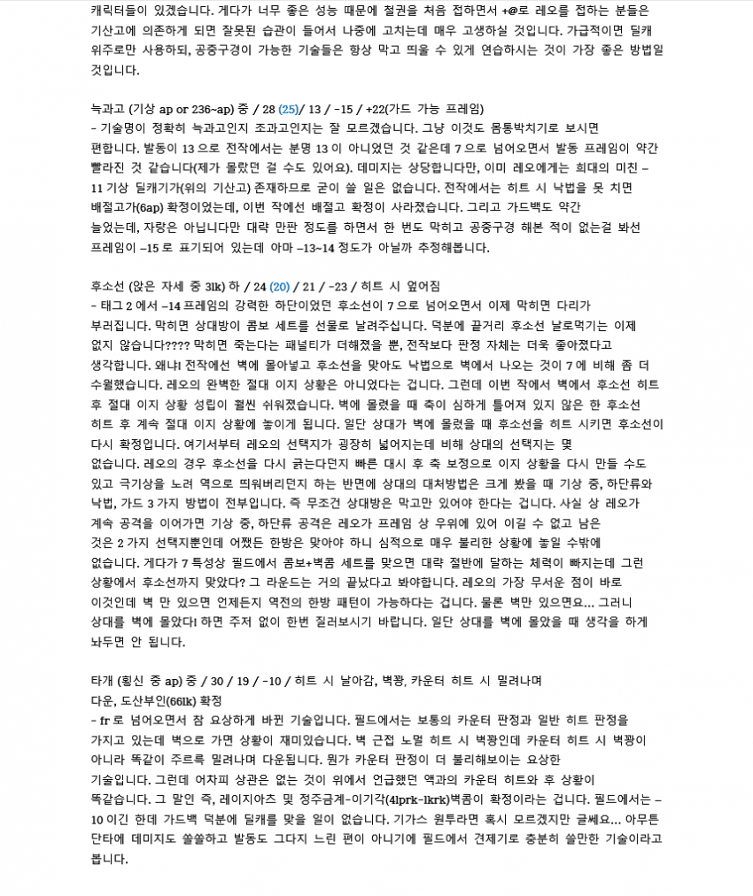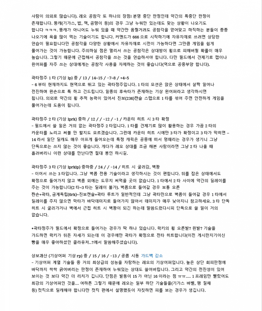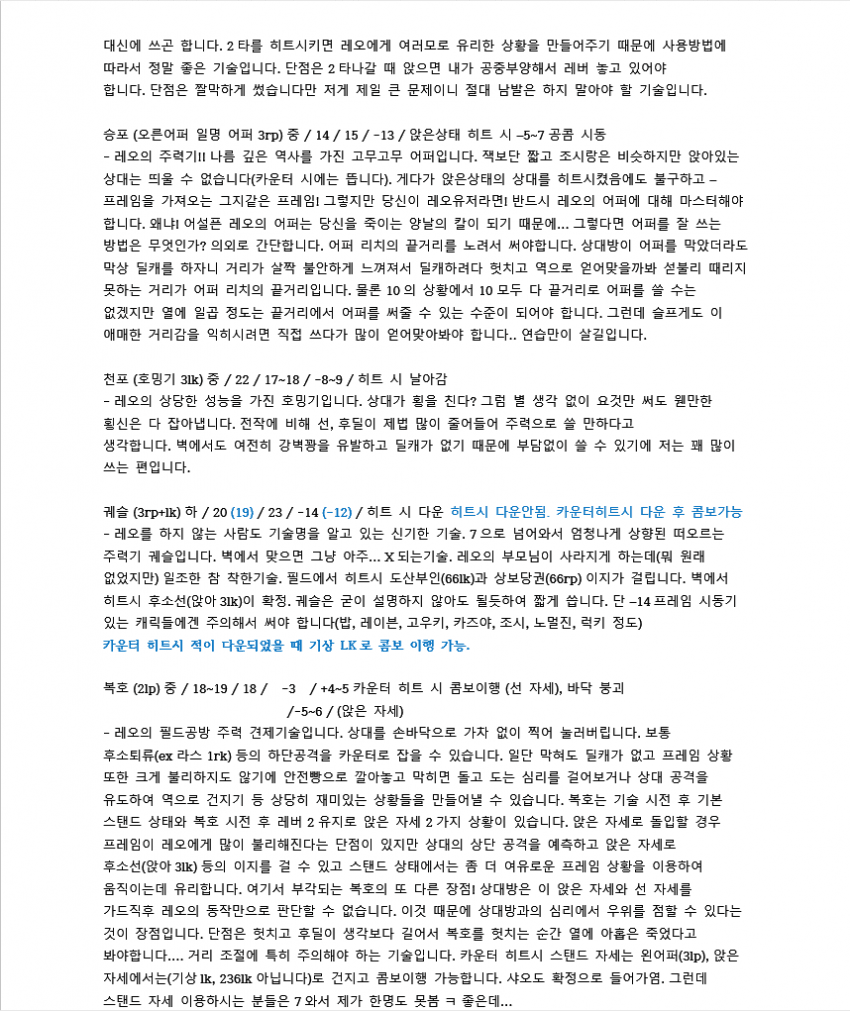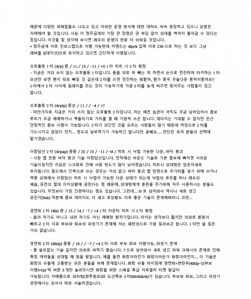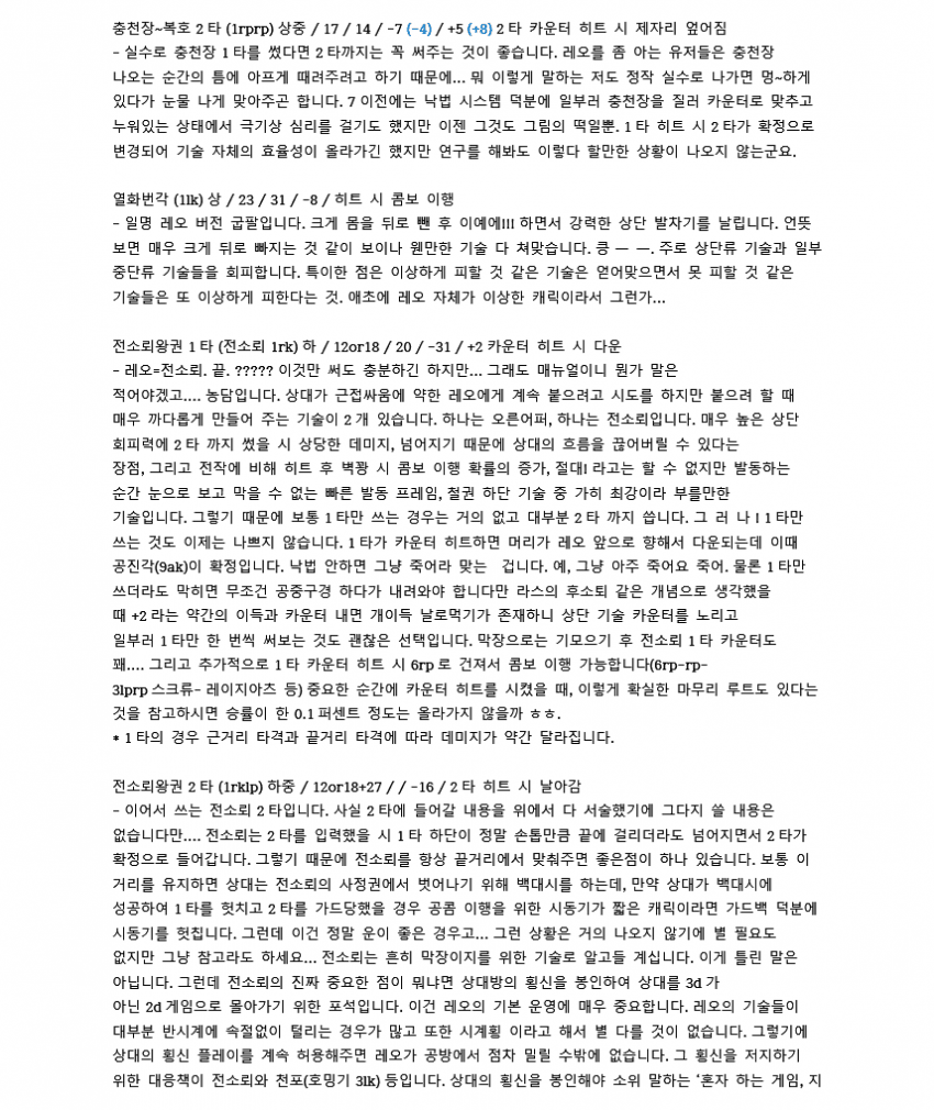 레오는 좋은 하단들 많이 가진 캐릭이지만 콤보데미지가 워낙 낮아서 한대만 운영이 불가능하다