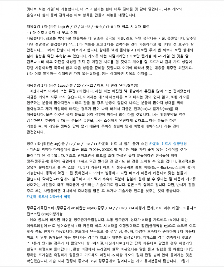 데미지는 레오 벽콤보 중 가장 강력합니다만 타이밍을 맞춰야 하고, 실패시 리스크가 좀 있는 편이라 확실히 들어가는 상황이 아니면 잘 안쓰는 편입니다.