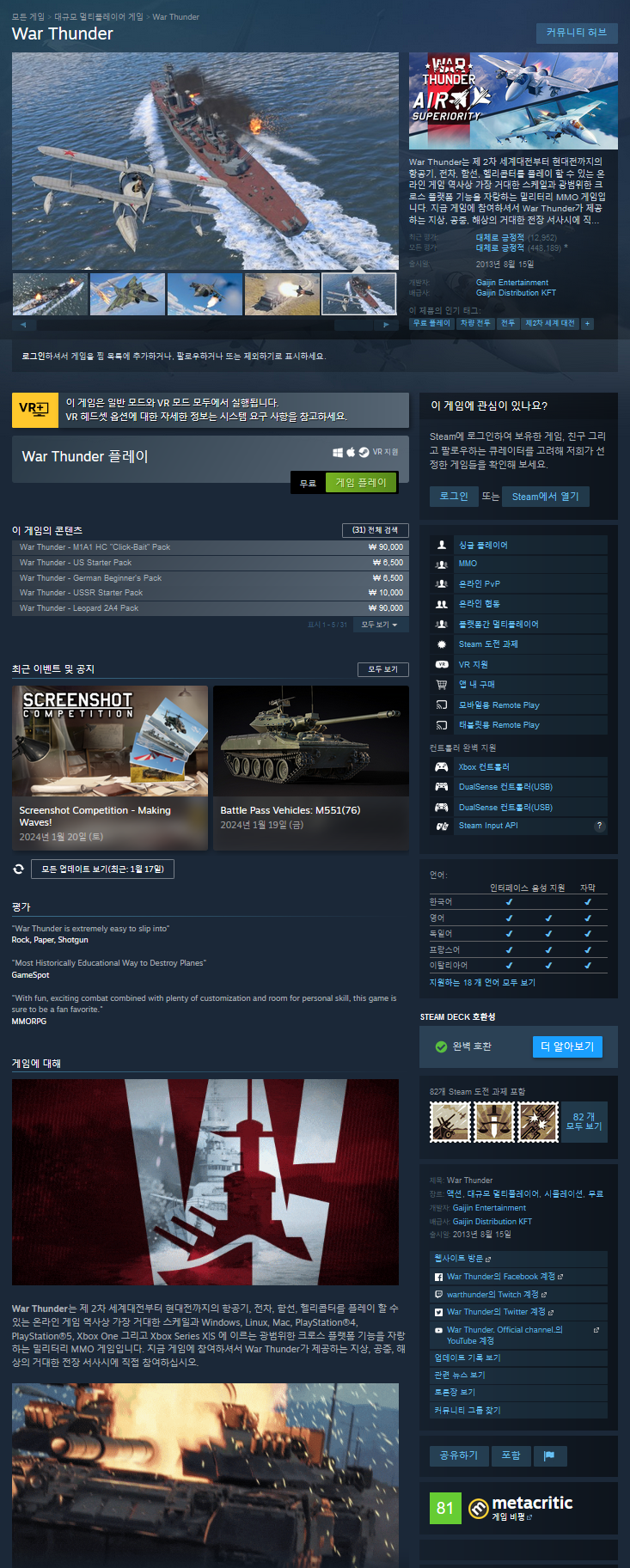 War Thunder는 제 2차 세계대전부터 현대전까지의 항공기, 전차, 함선, 헬리콥터를 플레이 할 수 있는 온라인 게임 역사상 가장 거대한 스케일과 Windows, Linux, Mac, PlayStation®4, PlayStation®5, Xbox One 그리고 Xbox Series X|S 에 이르는 광범위한 크로스 플랫폼 기능을 자랑하는 밀리터리 MMO 게임입니다. 지금 게임에 참여하셔서 War Thunder가 제공하는 지상, 공중, 해상의 거대한 전장 서사시에 직접 참여하십시오.