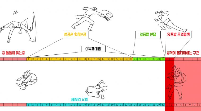 결국 요점은 제자리낙법시 상대 기상 3프레임째에 내 강기본기 판정이 나오게 하면 되는것이다