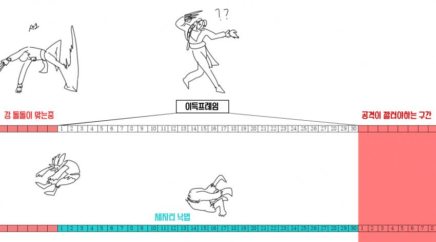 그럼 상대 제자리낙법시 기상 3프레임에 앉강손을 깔아두려면 36프레임을 소모시켜야한다